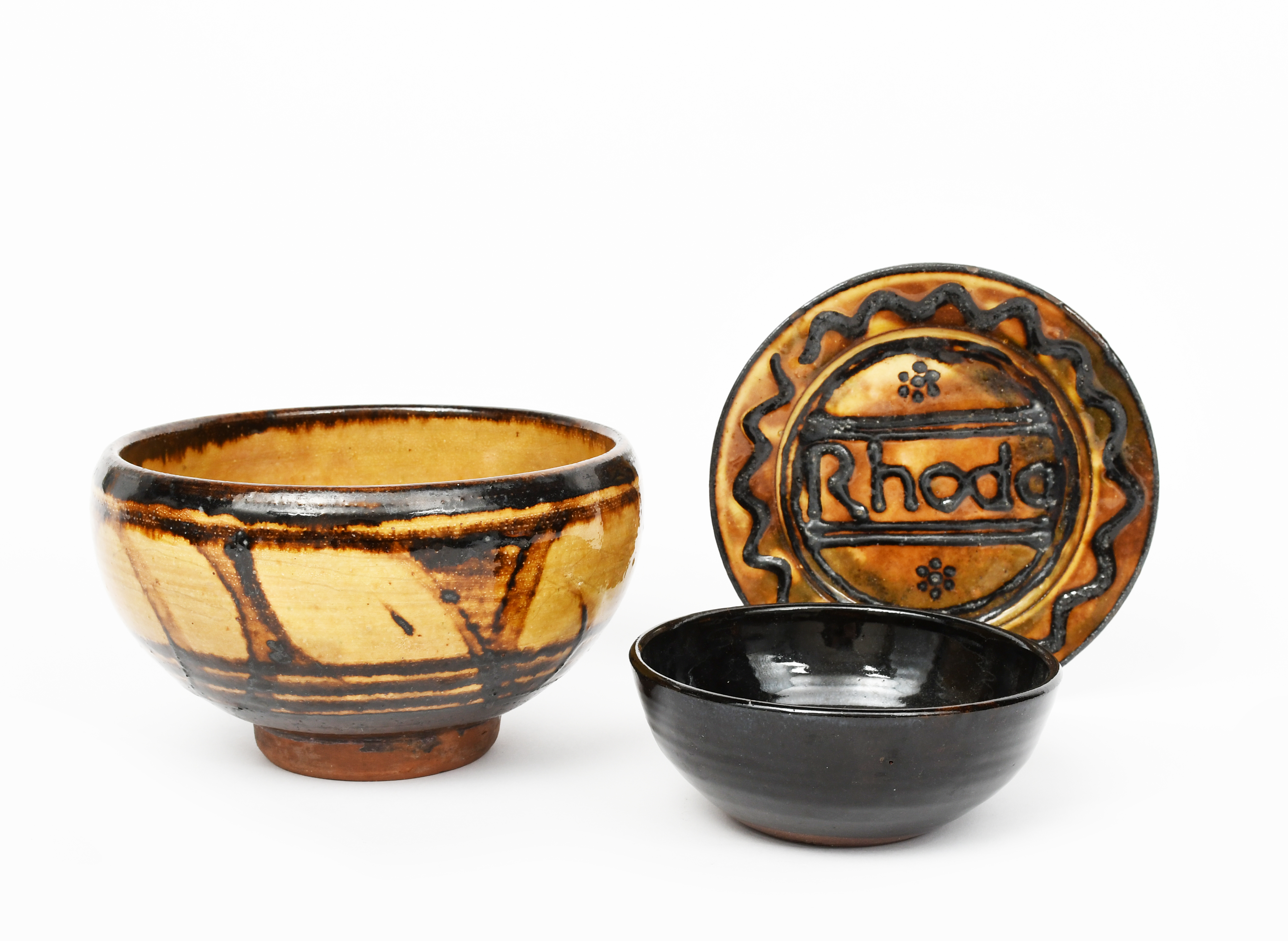 a Winchcombe Pottery footed bowl, slip decorated in brown and buff, a Winchcombe plate titled Rhoda and a small Sidney Tustin bowl,