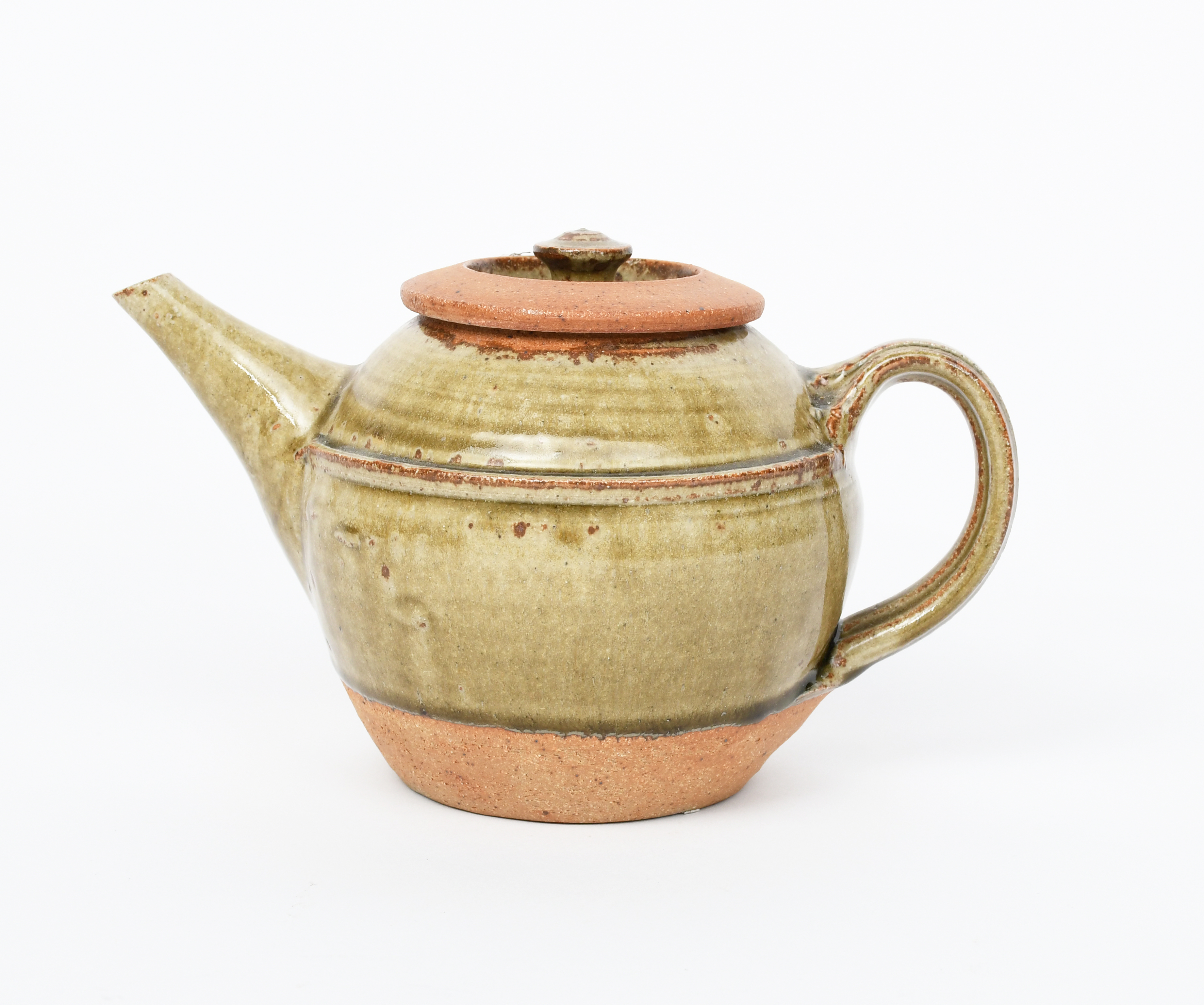a stoneware teapot and cover, covered to the foot with an ash glaze,