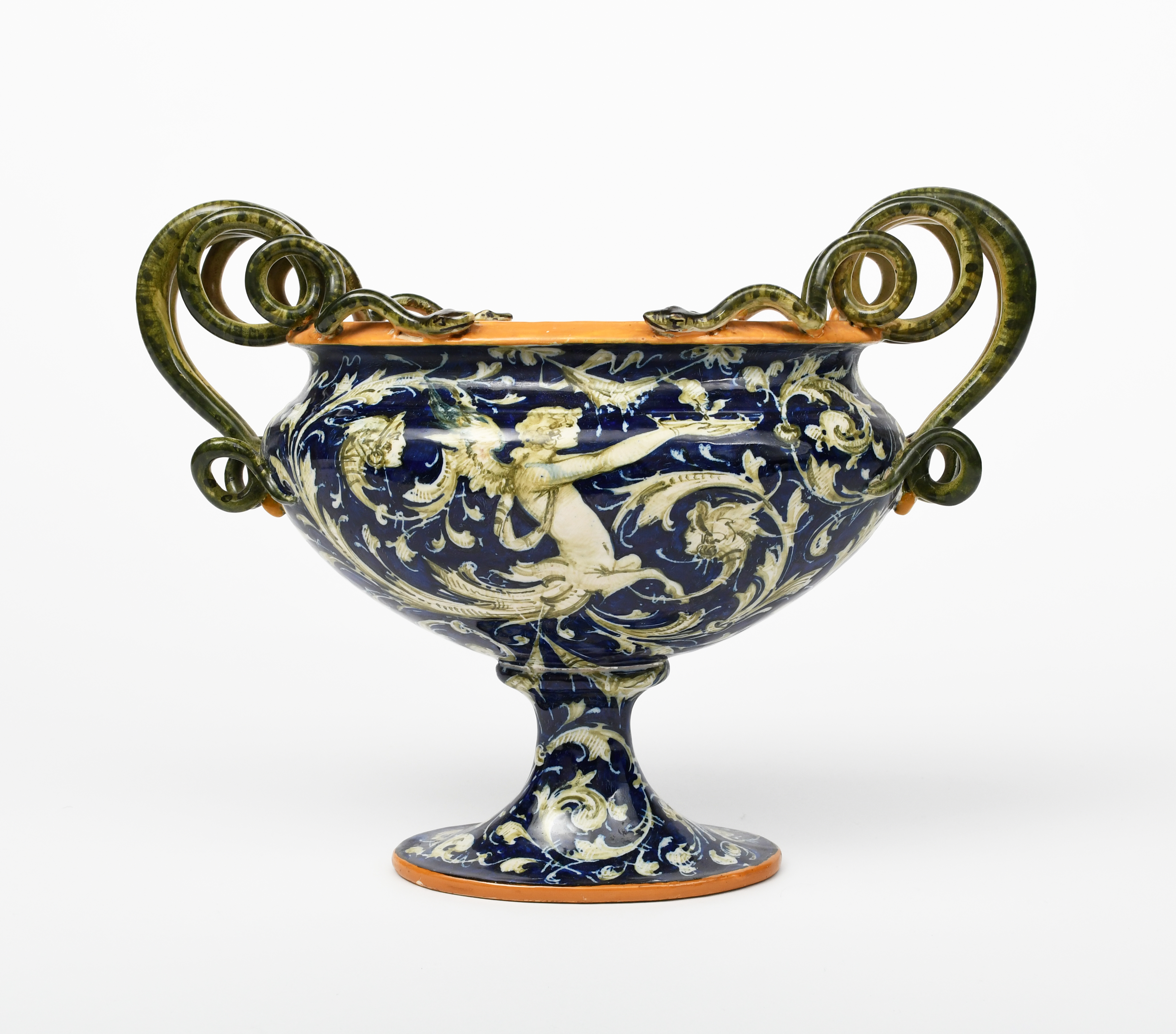A Molaroni Pottery twin-handled footed vase, Pesaro, Italy, with footed form with twin snake handles, the elliptical bowl painted with classical figures in scrolling foliage borders, in blue, yellow and green, painted M Pesaro mark, restored, 28cm. high