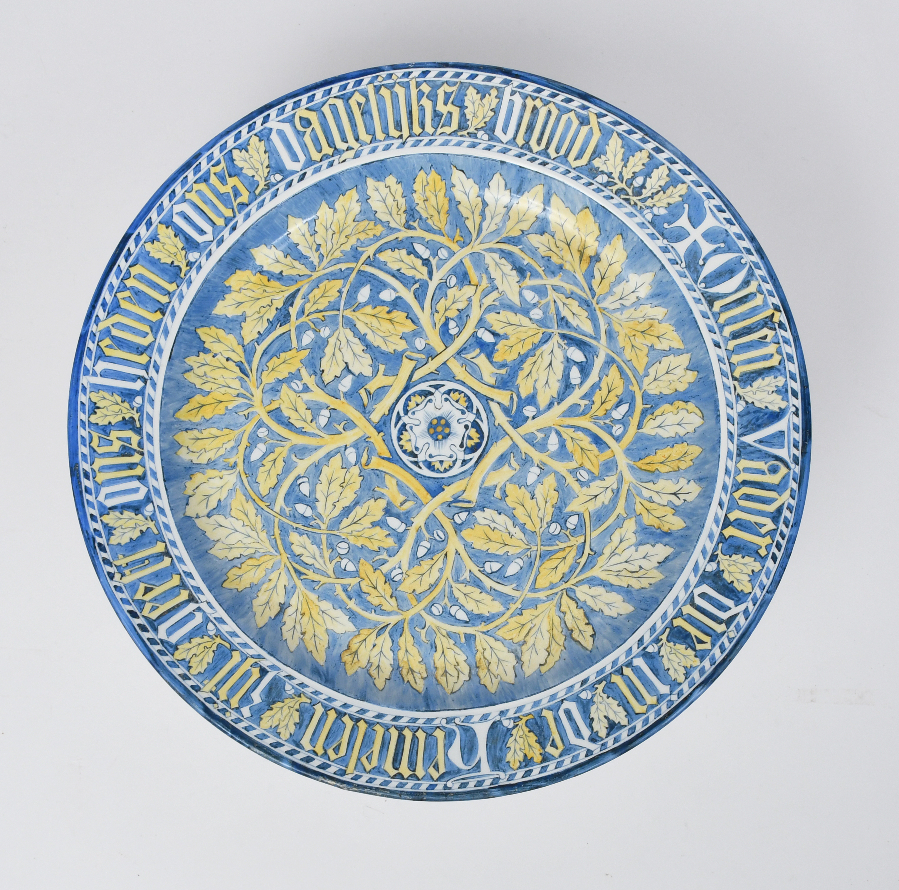 A Keramis Pottery charger, painted with a central Tudor Rose inside oak leaf and acorn border, the rim with German inscription, in blue and yellow on a white ground, impressed Keramis mark, painted AB artist monogram to the rim, 37.5cm. diam.