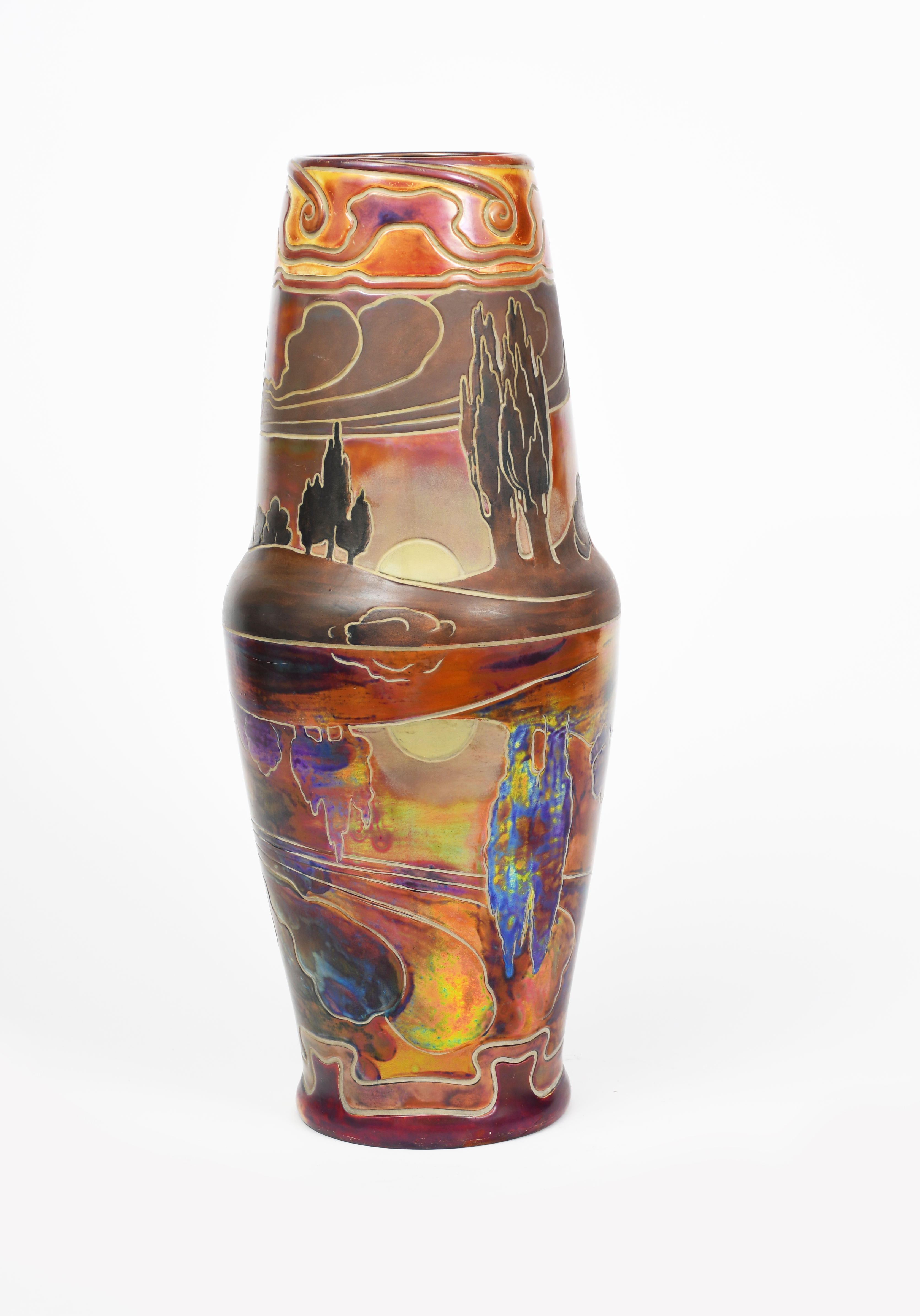 A large Zsolnay Pecs vase, model no 7332, slightly swollen cylindrical form, with shoulder, incised and painted with a sunrise landscape reflected in a lake, impressed factory mark and number, professionally restored, 53cm. high