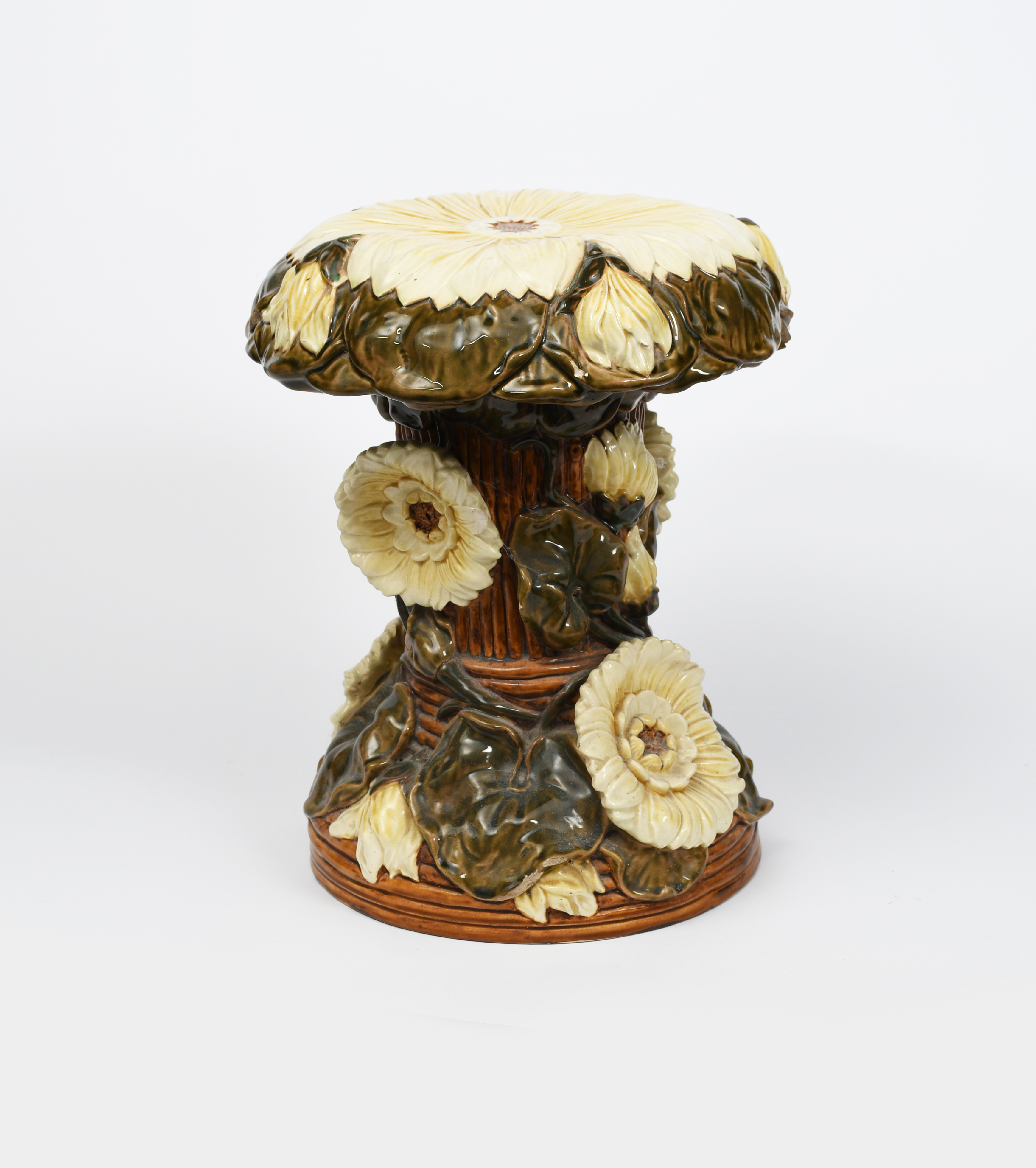 An Art Nouveau Zsolnay Pecs Lotus Ware garden seat, designed by Julia Zsolnay, model no.3698, modelled as a large flowerhead seat, above bamboo column with cream climbing flower, in shades of cream, brown and green impressed factory marks, minor damages, 44cm. high
