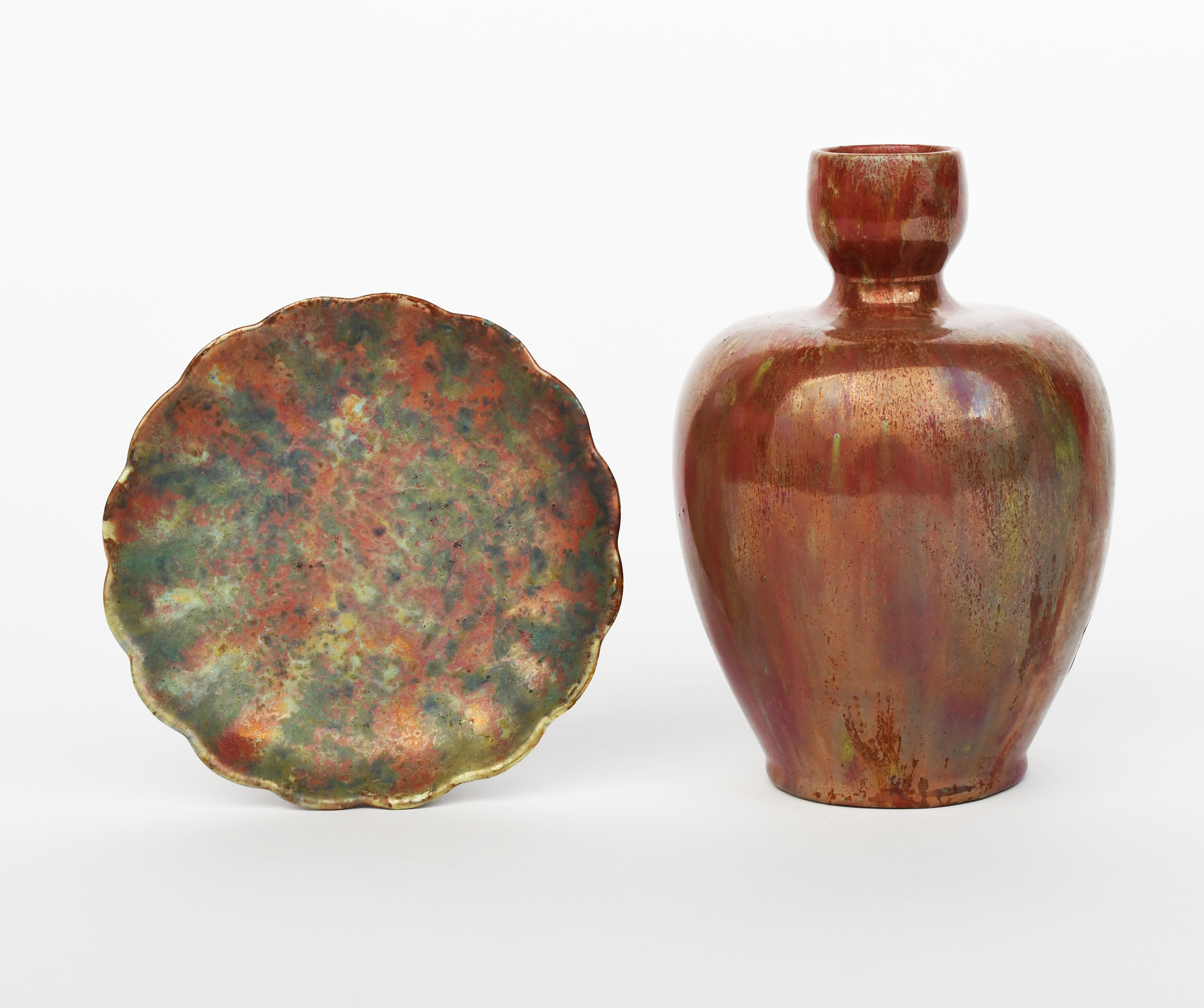 A TL Delft pottery vase, shouldered ovoid form, with knopped neck, covered in a streaked red and gold glaze, and a TL Delft plate with scallop rim, painted marks, 18cm. high (2)