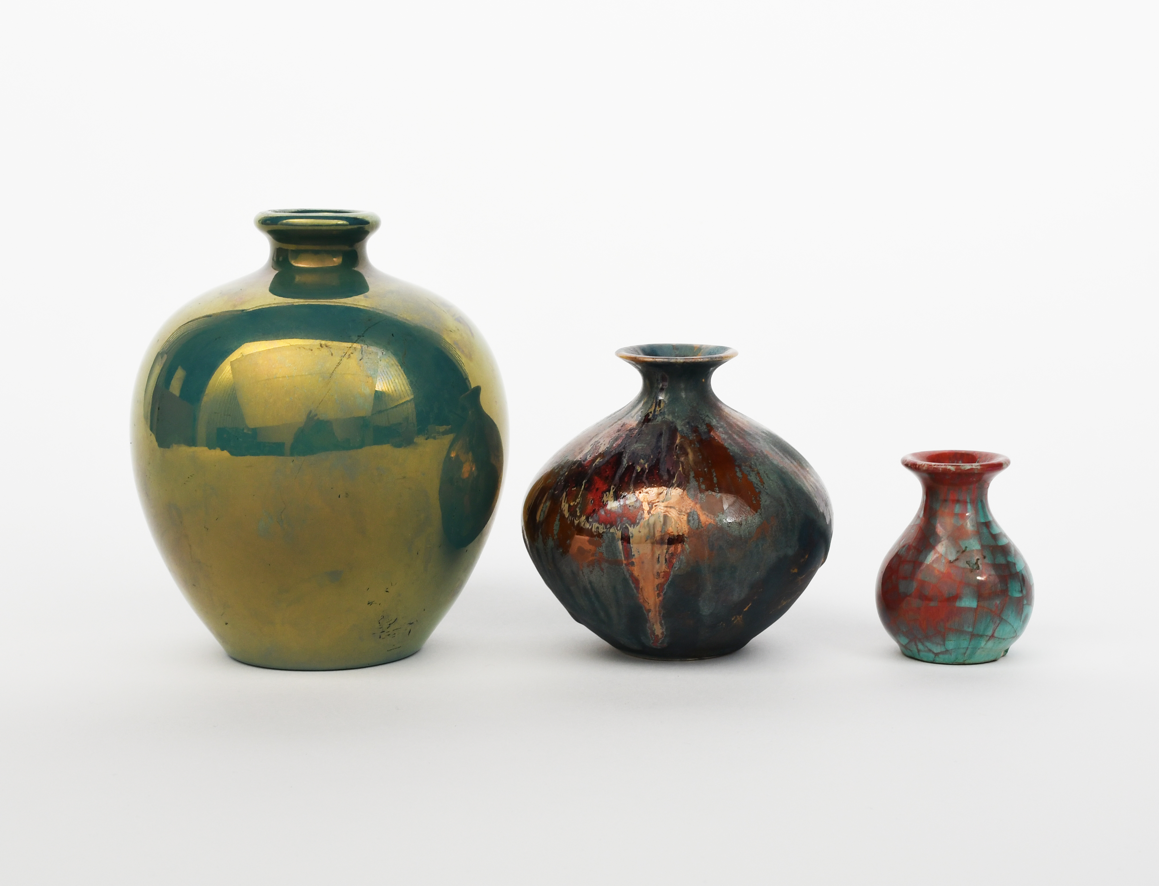 A St Lukas Utrecht pottery vase, shouldered form with flaring top rim, covered in a golden, green lustre, and two other pottery vases with red and turquoise glazes, printed factory mark, 16cm. high (3)