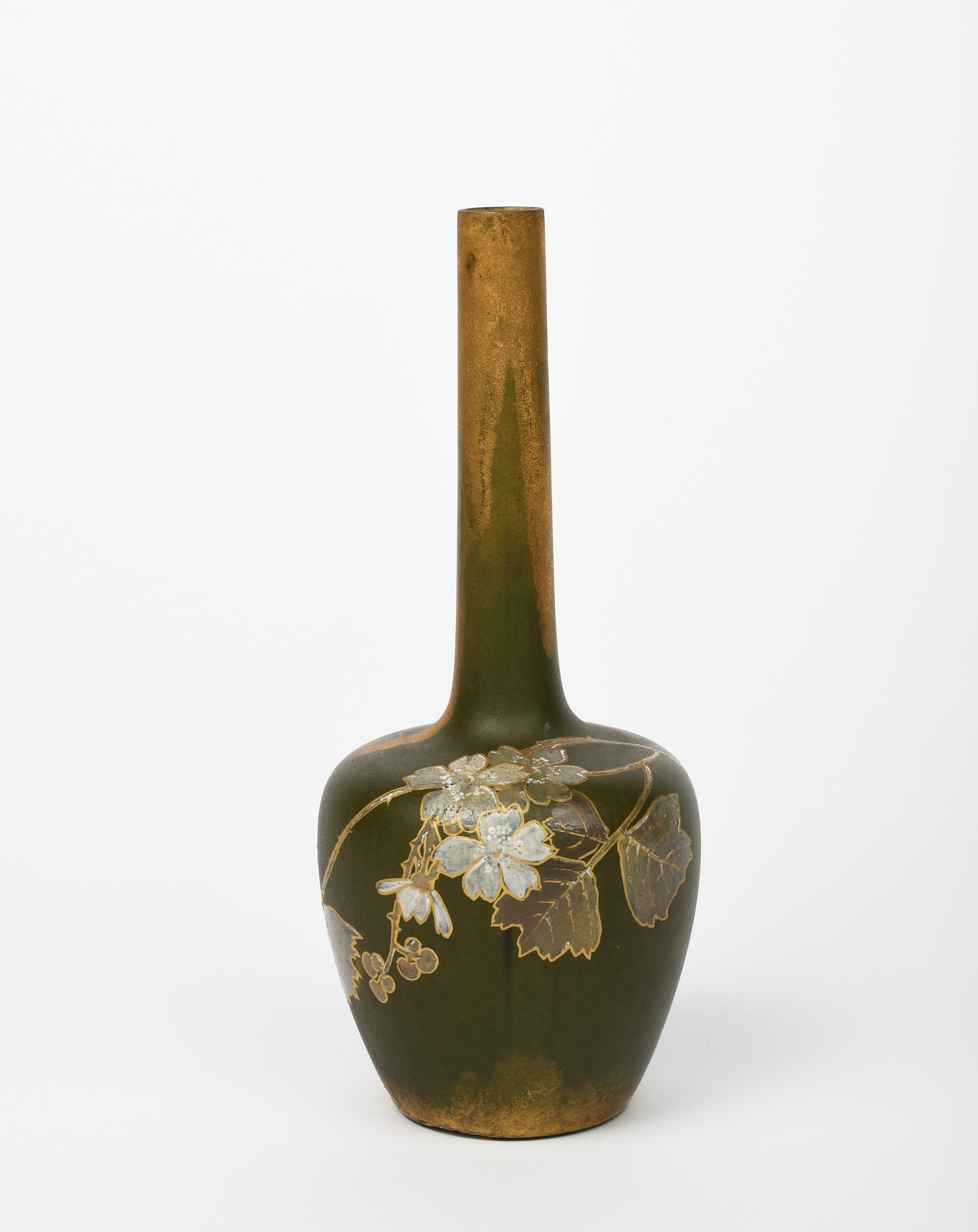 An Art Nouveau Clement Massier Golfe Juan solifleur vase, ovoid with tall cylindrical neck, painted with prunus blossom in white, highlighted in gilt, on an olive green ground, impressed factory marks, flat chip to the foot rim, 25cm. high