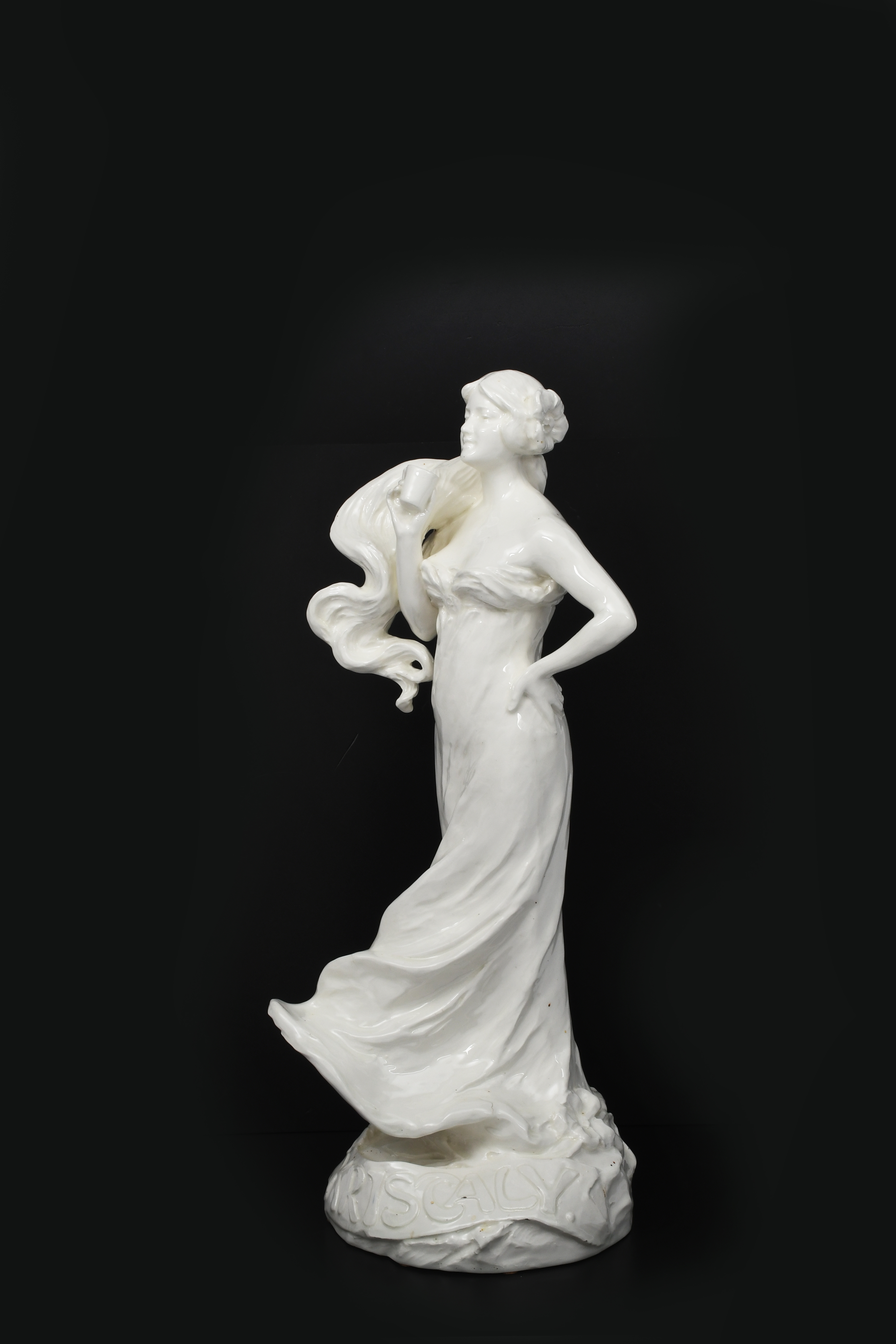 'Kriscaly' an Art Nouveau pottery advertising figure, modelled as an art nouveau maiden holding a beaker, covered in a white glaze, the base inscribed 'Kriscaly', impressed number and indistinct factory mark to base, chips, 56cm. high