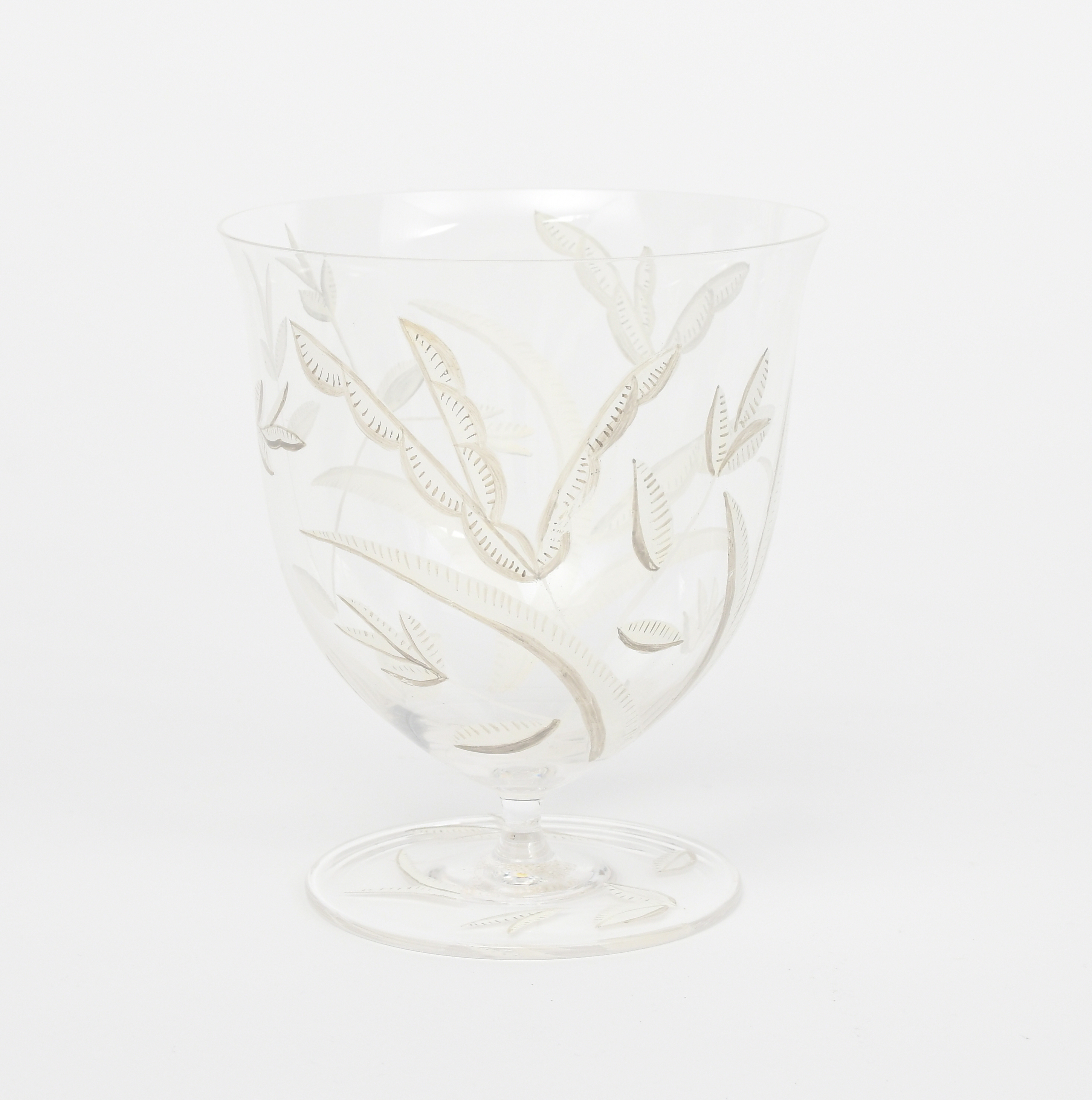 An enamelled glass vase in the manner of Dagobert Peche for the Wiener Werkstatte, footed form, clear glass enamelled with simple foliate sprays in white painted WW to base, 14.5cm. high