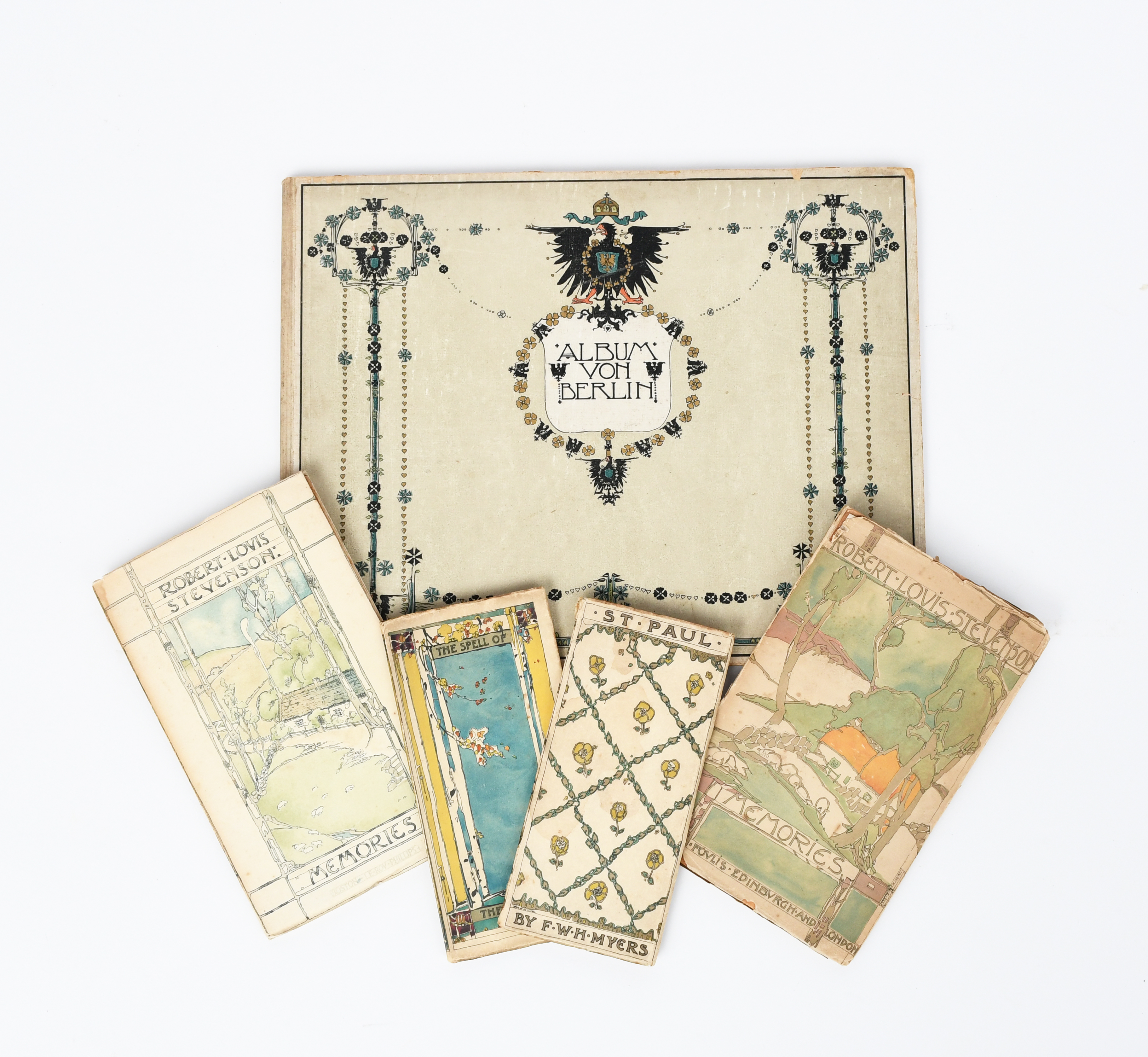 The Spell of the Open Air and St Paul two books with covers designed by Jessie M King, published by Turnbull & Spears, 'Album From Berlin' published and two version of 'memories' by Robert Louis Stevenson, all with covers designed by Jessie M King, (5)