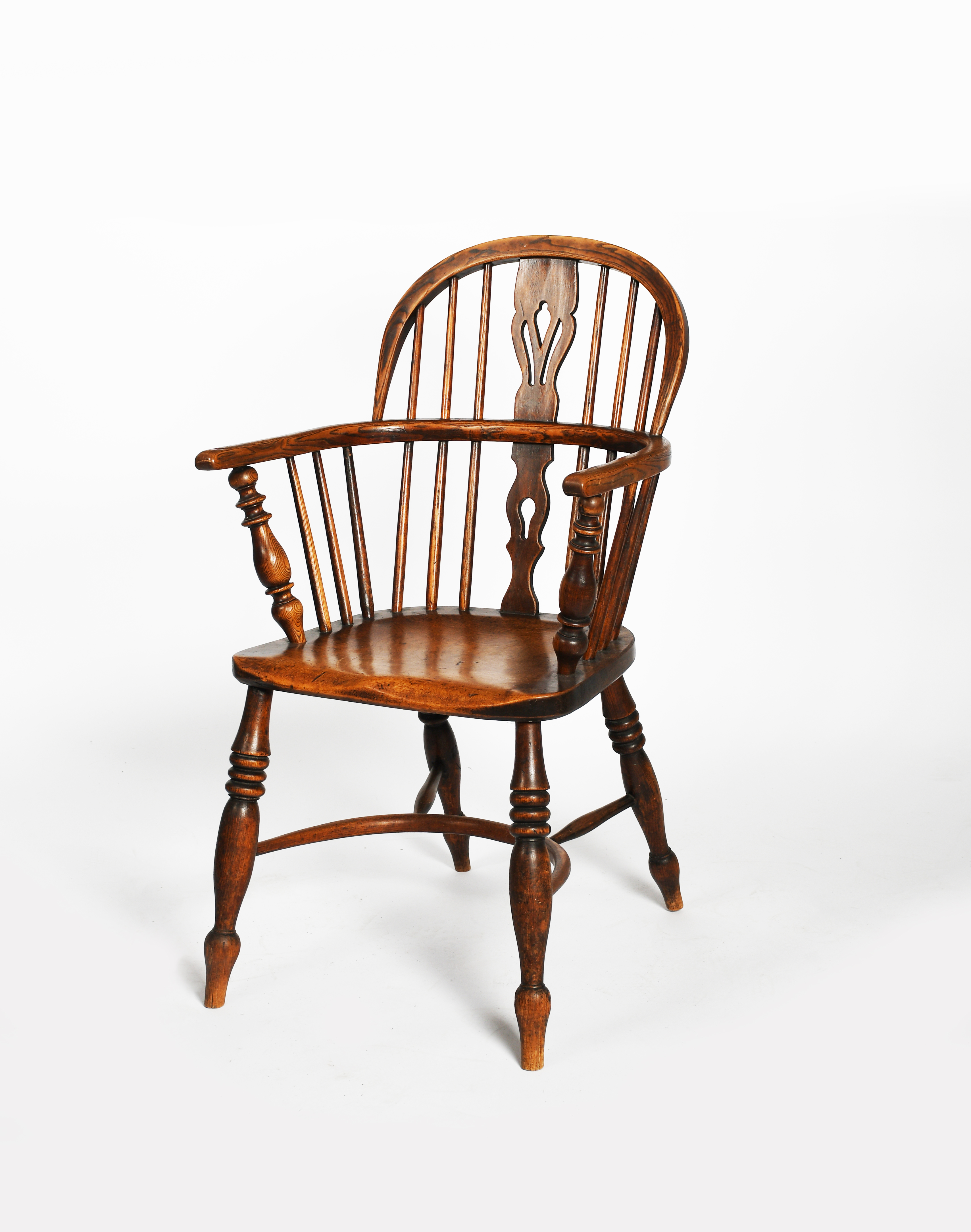 An ash and elm Windsor armchair, on turned legs, crinoline stretcher, unsigned, 92cm. high