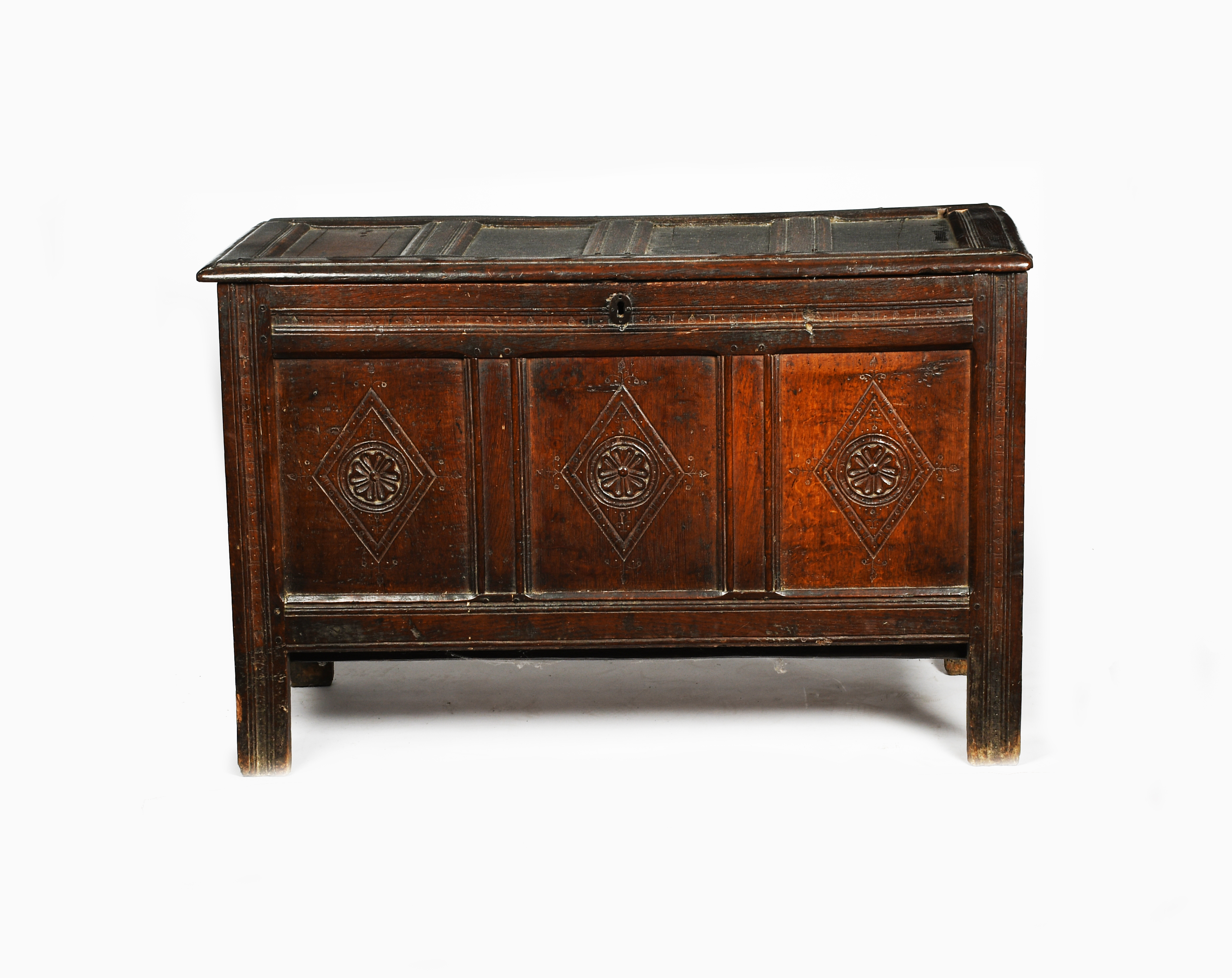 A 17th/18th century oak three panel coffer, with hinged top, carved with diamond shaped panel