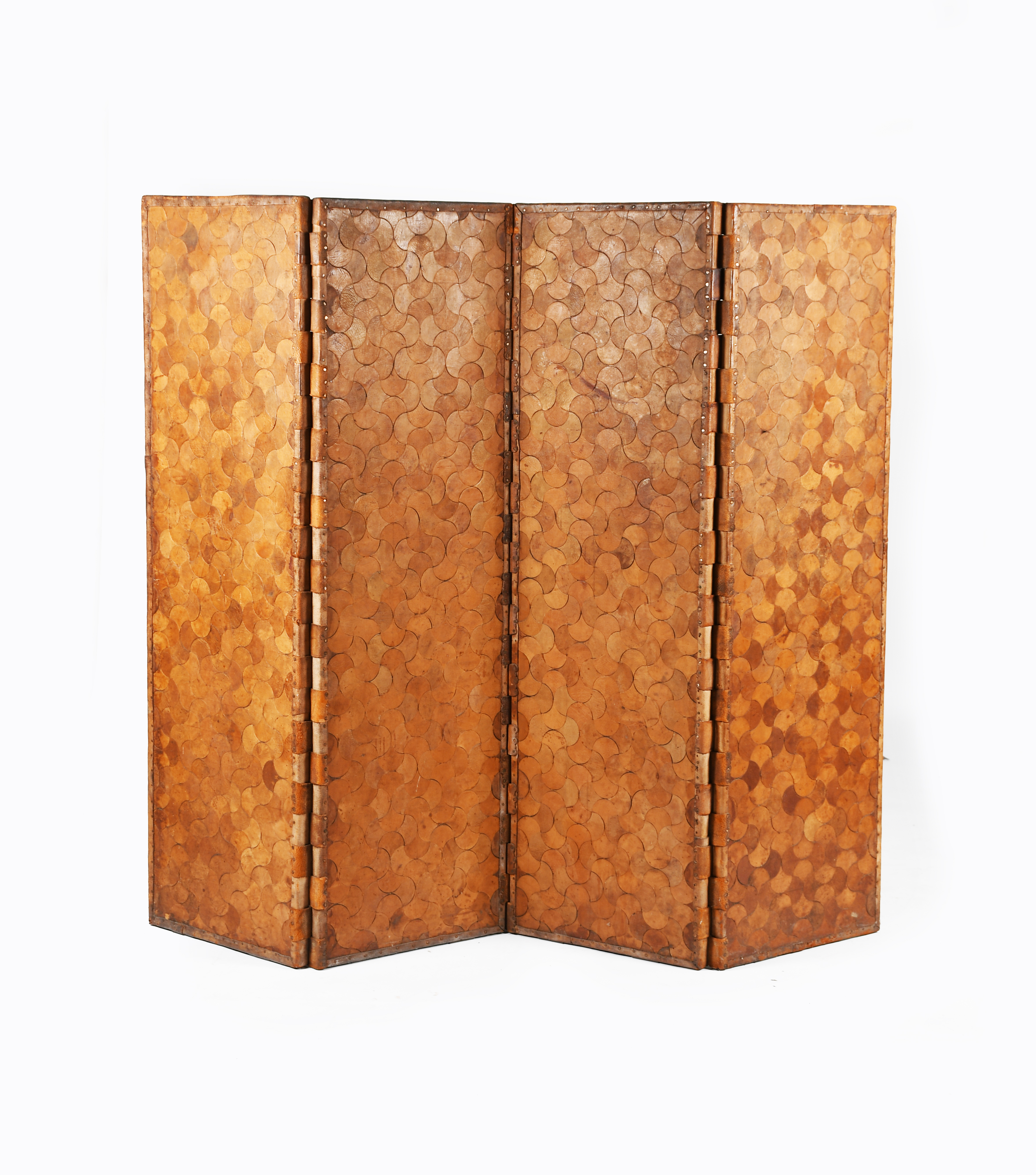 An unusual four-fold leather screen, unsigned, 46 x 152cm (each panel)