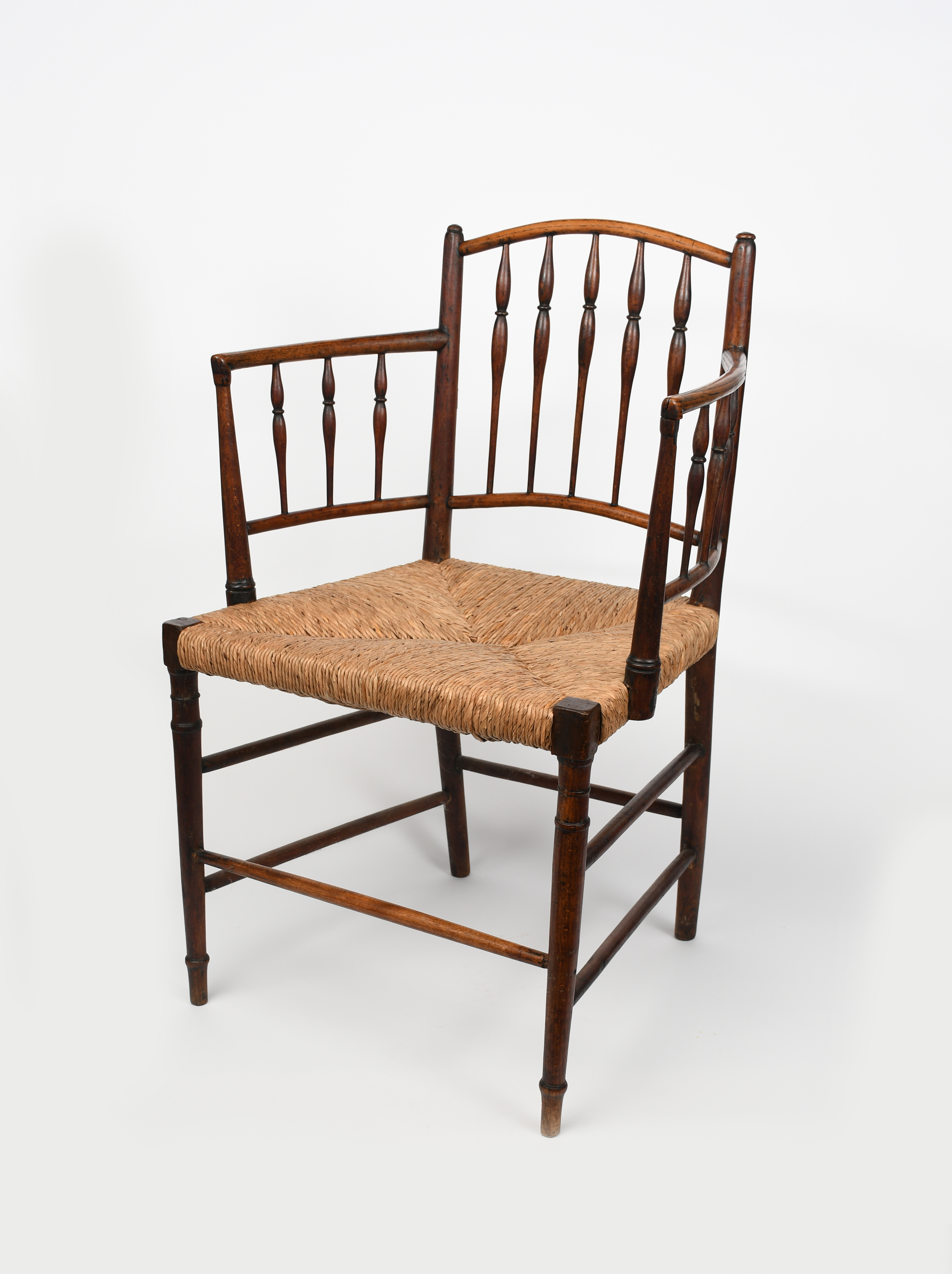 A rush seated ash armchair, with turned bobbin back and arms, unsigned, 81.5cm. high