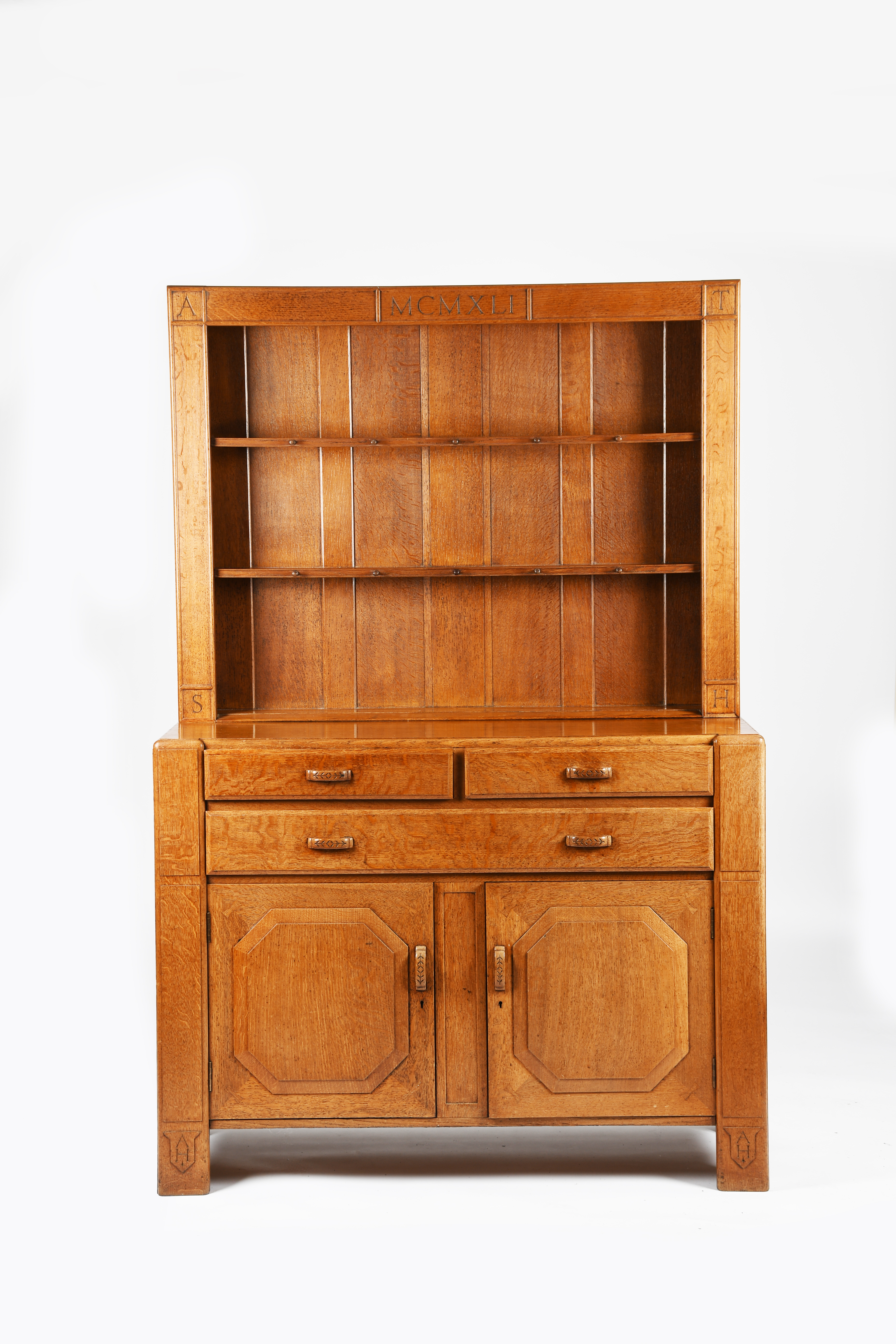 A Heal's oak dresser designed by Ambrose Heal, made as a wedding present for his son Anthony in 1941, carved panel doors below drawers, below panelled, shelved top with turned wooden peg hooks, carved inscriptions, paper label to drawer,