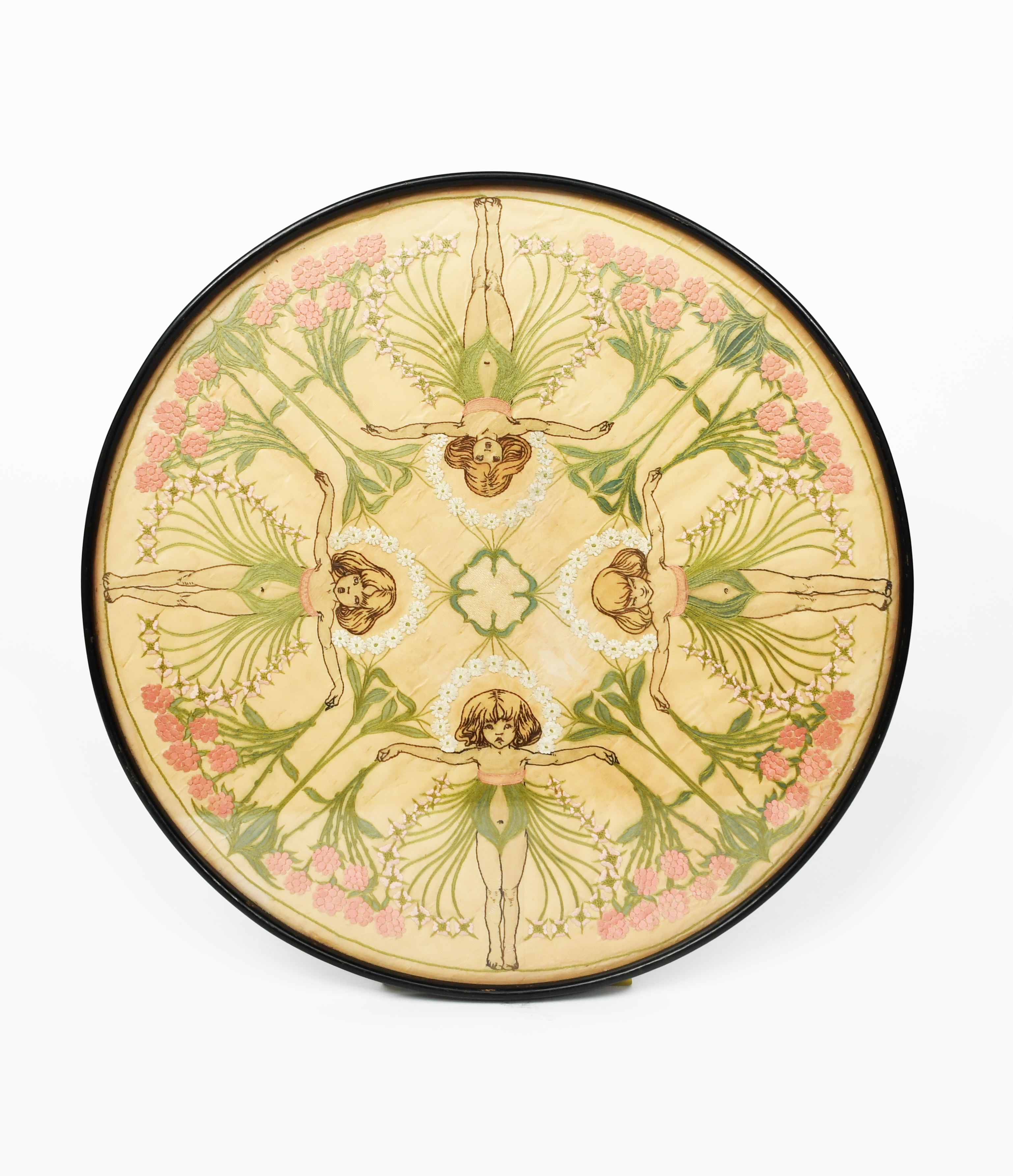 A silk embroidered panel by Christine Angus, the circular silk panel embroidered with four radiating female figures and floral panels in green, pink and white silk thread, framed unsigned, 51cm. diam.