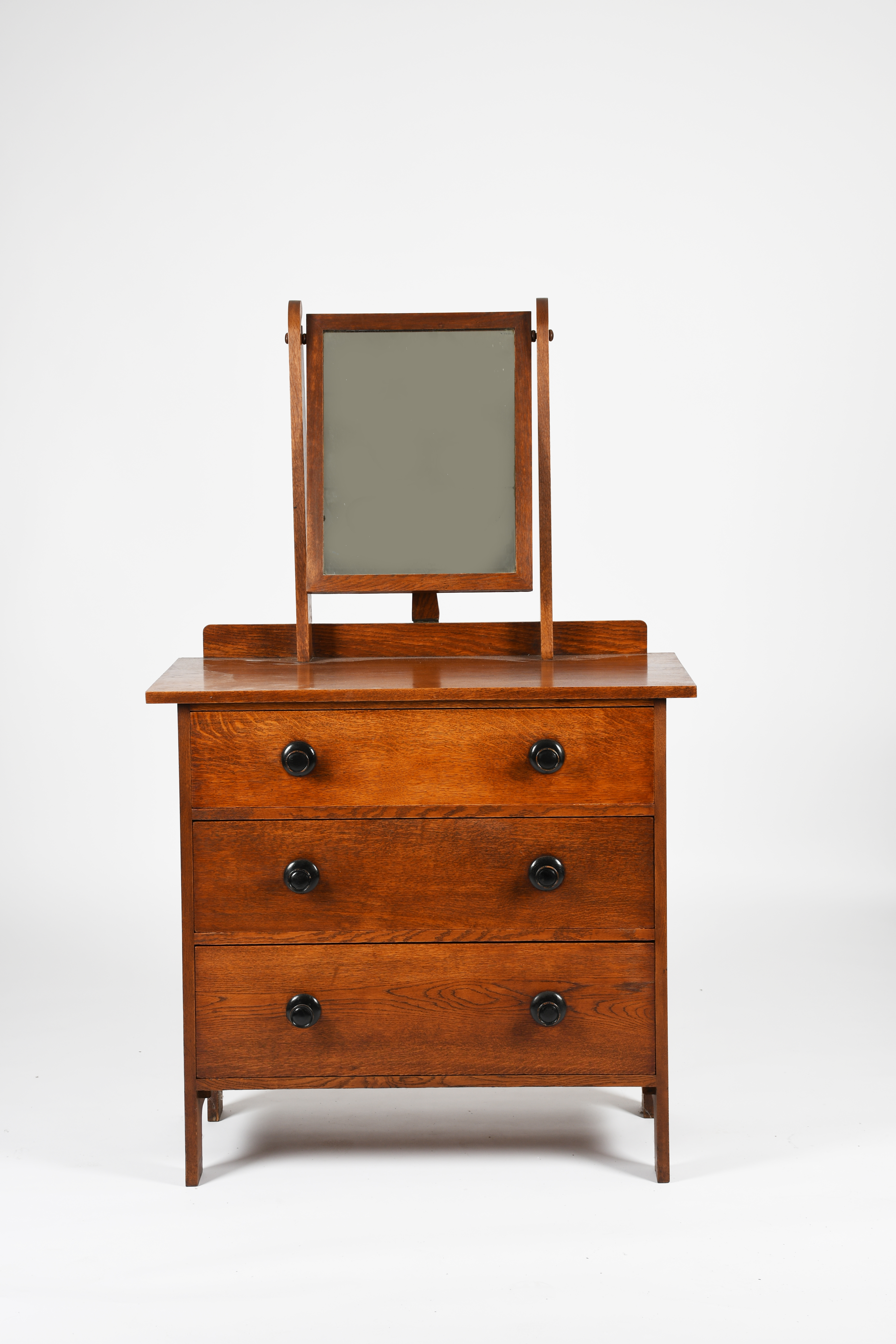 A Heal's oak John Dawson dressing chest designed by Ambrose Heal, designed 1919, rectangular with three drawers, the rectangular top with shallow back, and angled dressing mirror, ebonised wood handles, 91 x 49cm, 130cm high