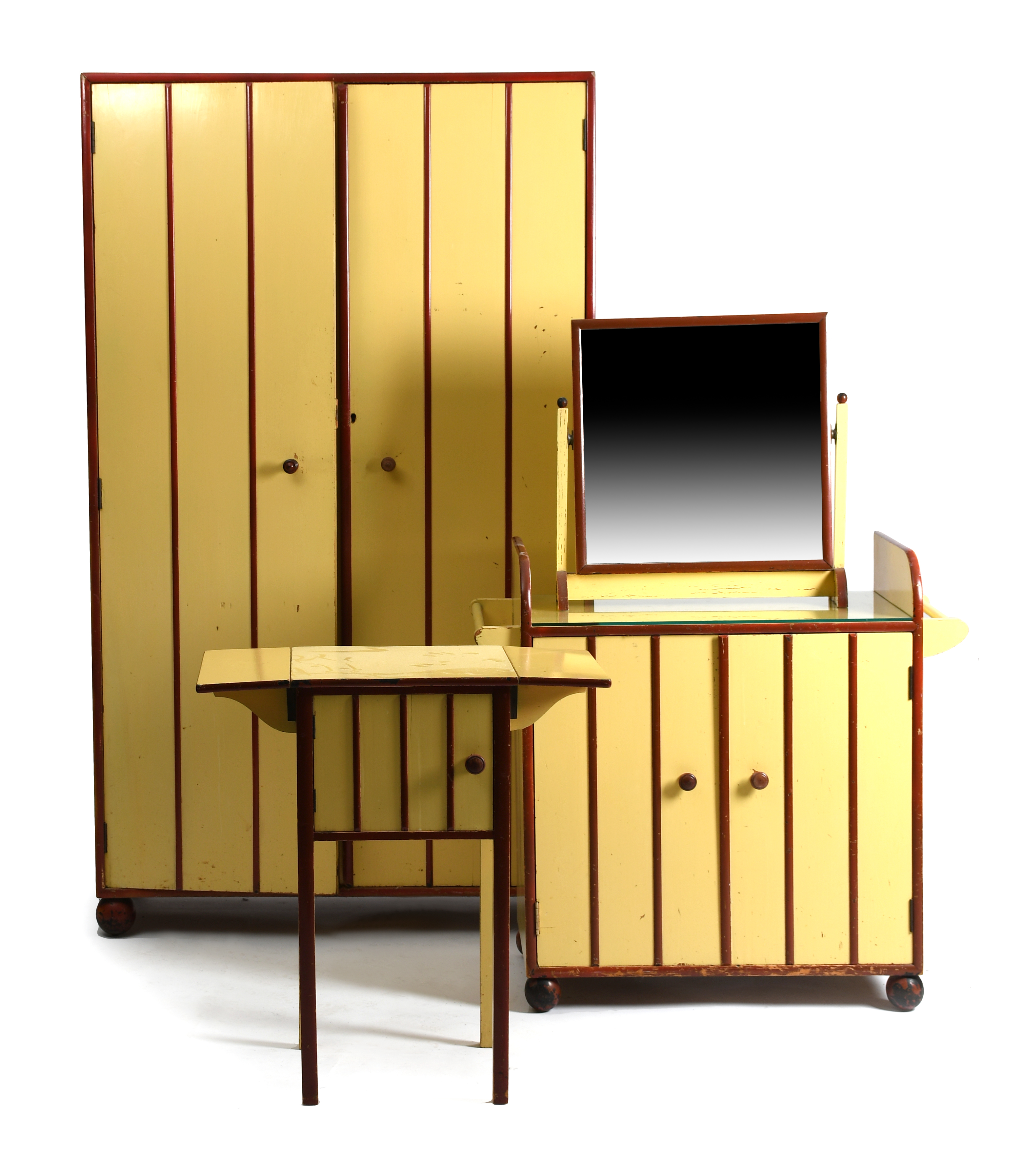 A Heal & Son painted wood bedroom suite, comprising a two-door wardrobe, washstand, dressing-table mirror, bedside table with side flaps, painted red and yellow, on ball feet, unsigned, 184 x 107cm (wardrobe), (4)