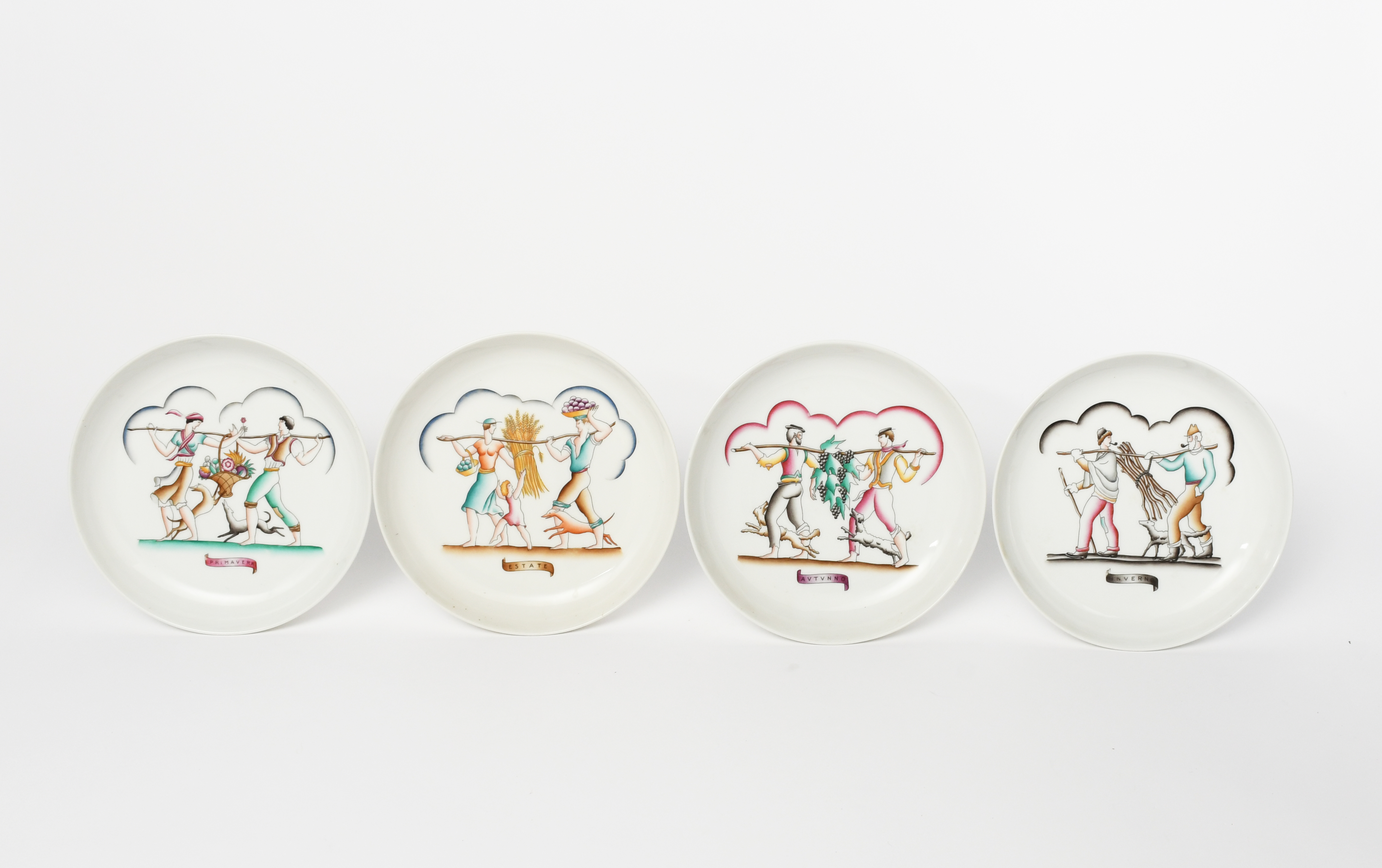 A set of four Richard Ginori Le Quattro Stagioni plates designed by Gio Ponti, decorated with Italian farmers working, titled Primavera, Estate, Autumno, and Inverno, in colours, printed factory marks, 30-9, 23cm. diam. (4)