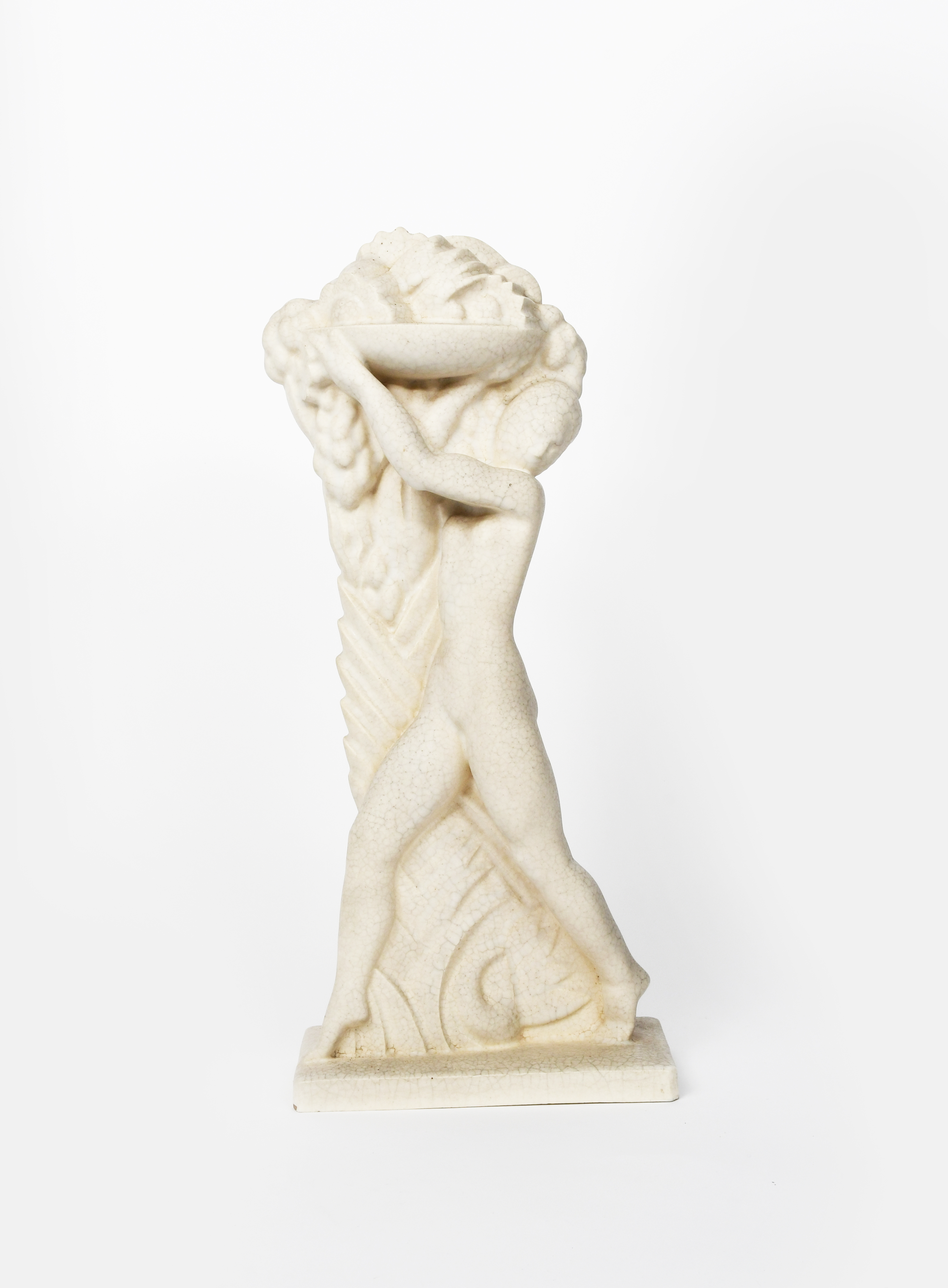 A Primavera Pottery figure of a woman holding a bowl of fruit aloft, stylised form, covered in a crackled white glaze, printed Primavera France mark, chips to base, 54.5cm. high