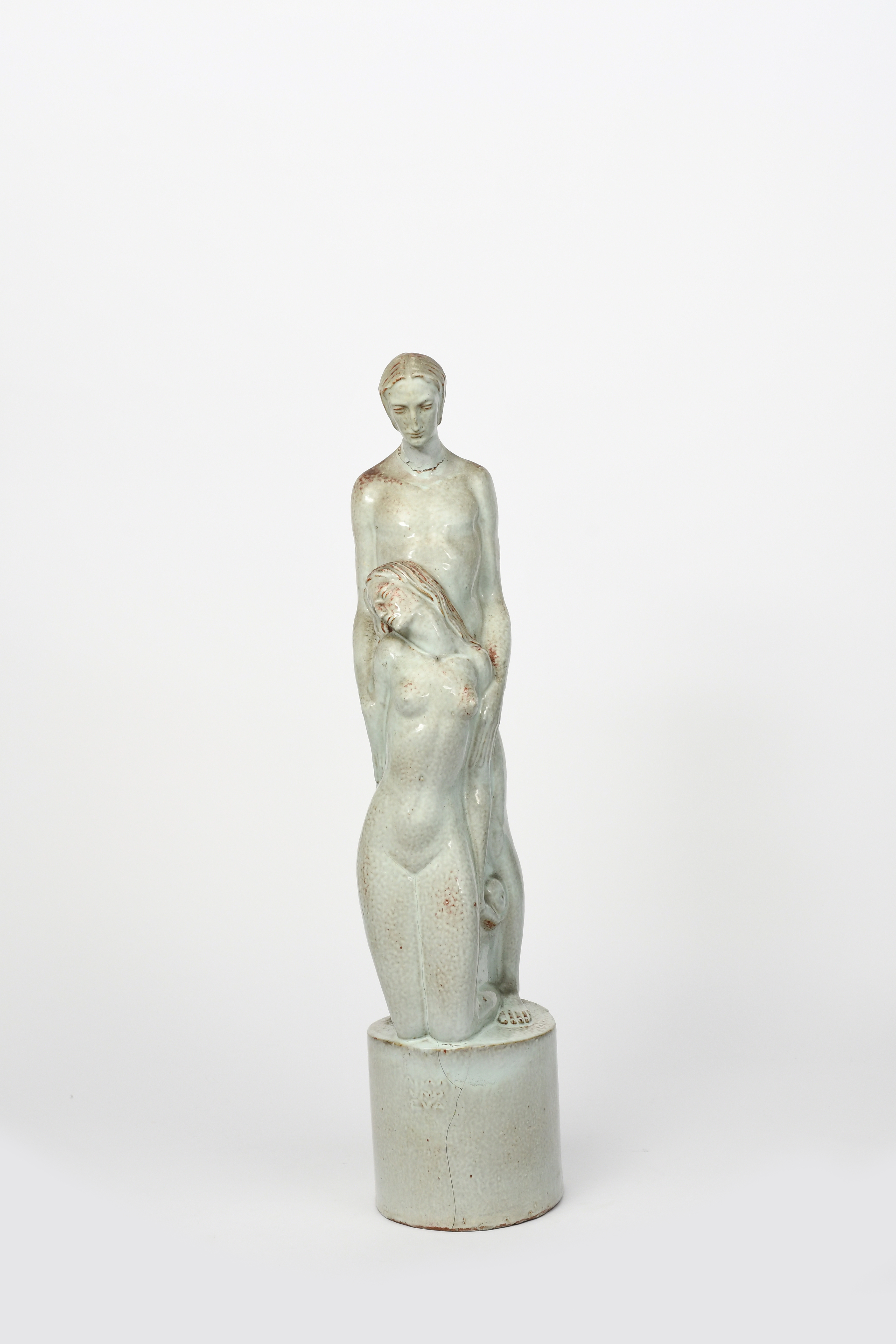 a pottery sculpture, glazed in pale blue and rust