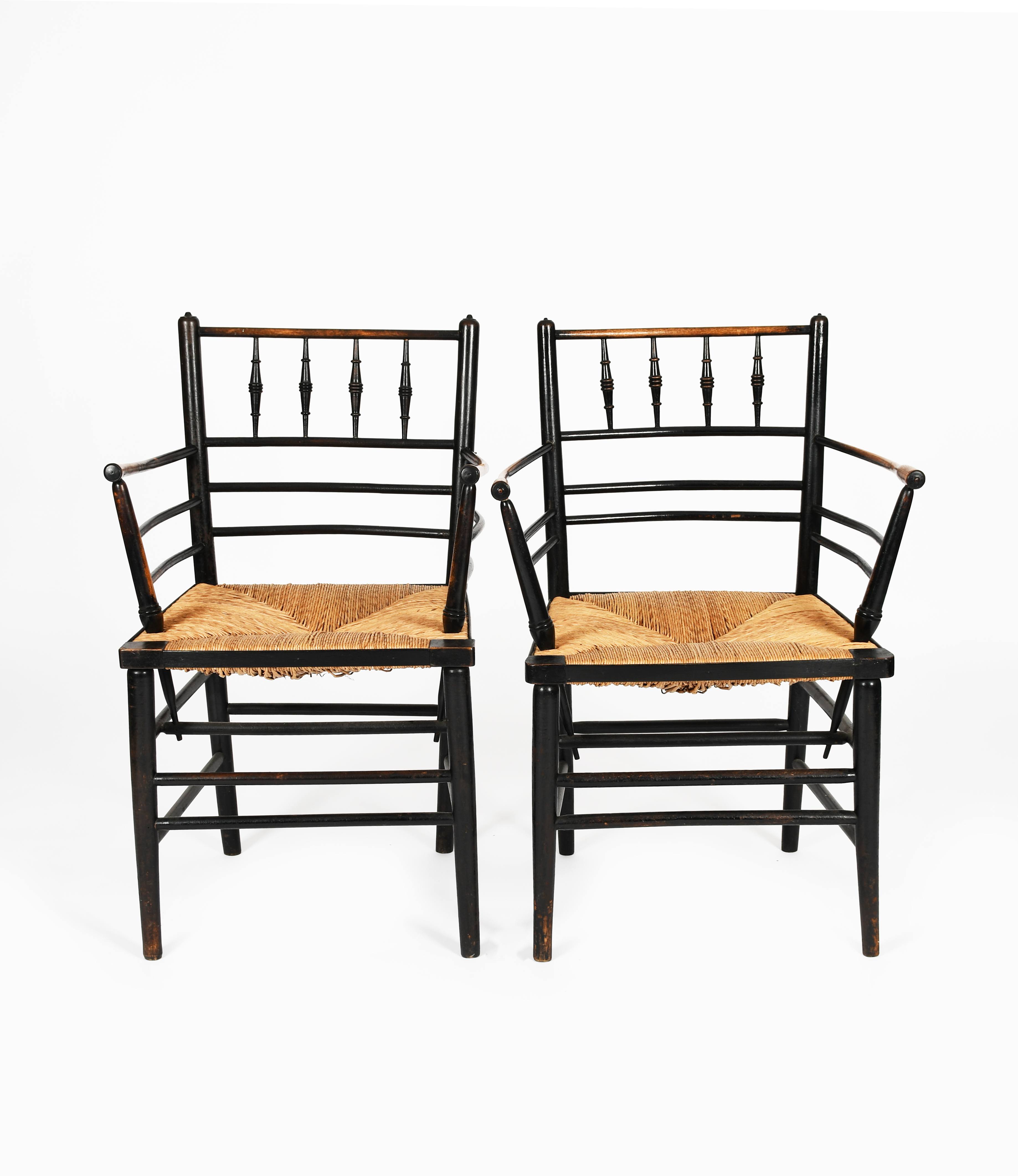 A pair of Morris & Co Sussex armchairs, ebonised wood with rush seat, unsigned, 85cm. high, (2)