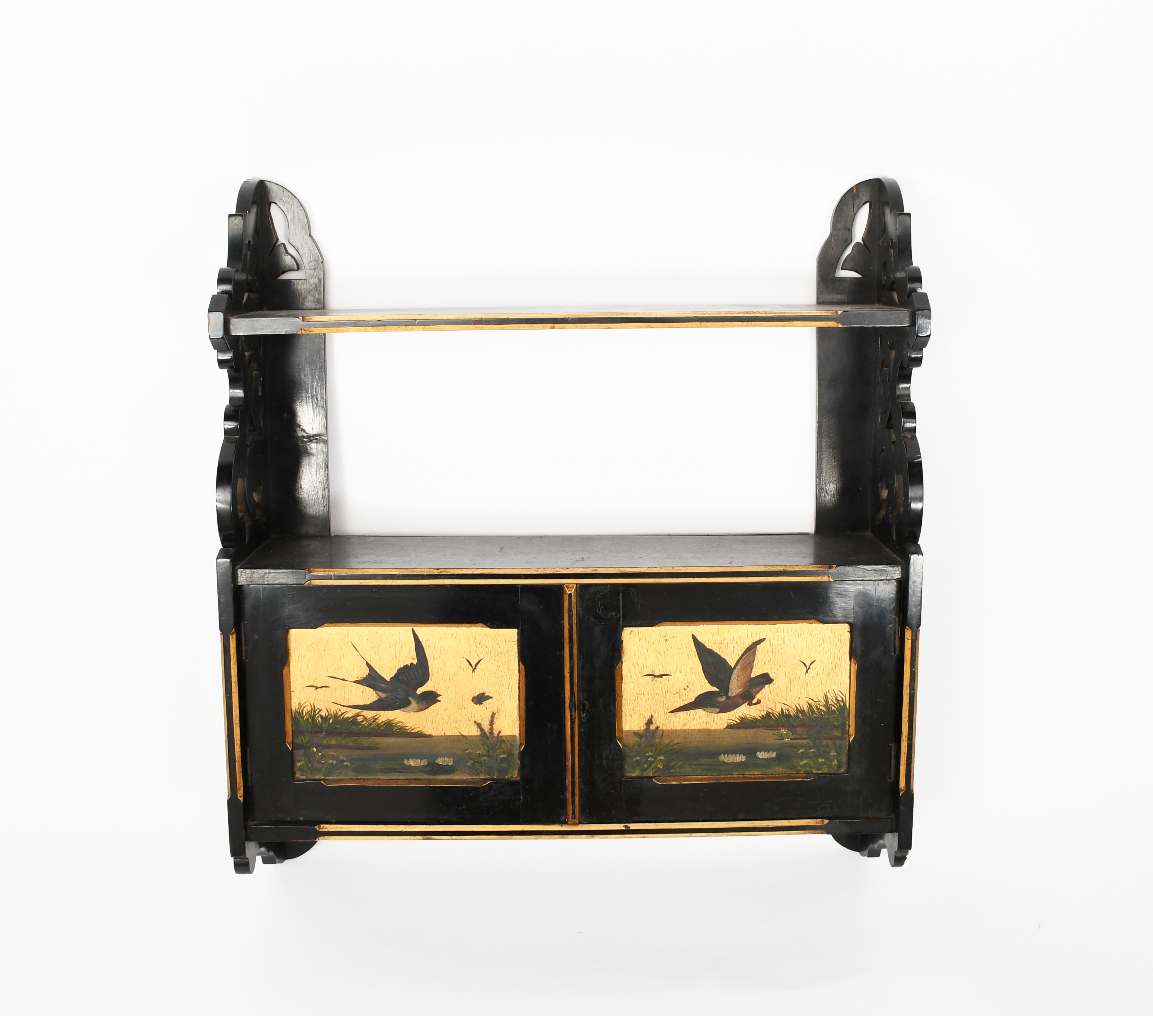 A small Aesthetic Movement hanging wall cabinet, rectangular two door compartment, painted with panels of birds flying, swallows and a kingfisher, over a river landscape, in colours on a gilt ground, under two shelves, unsigned, 58cm. wide. 65cm. high