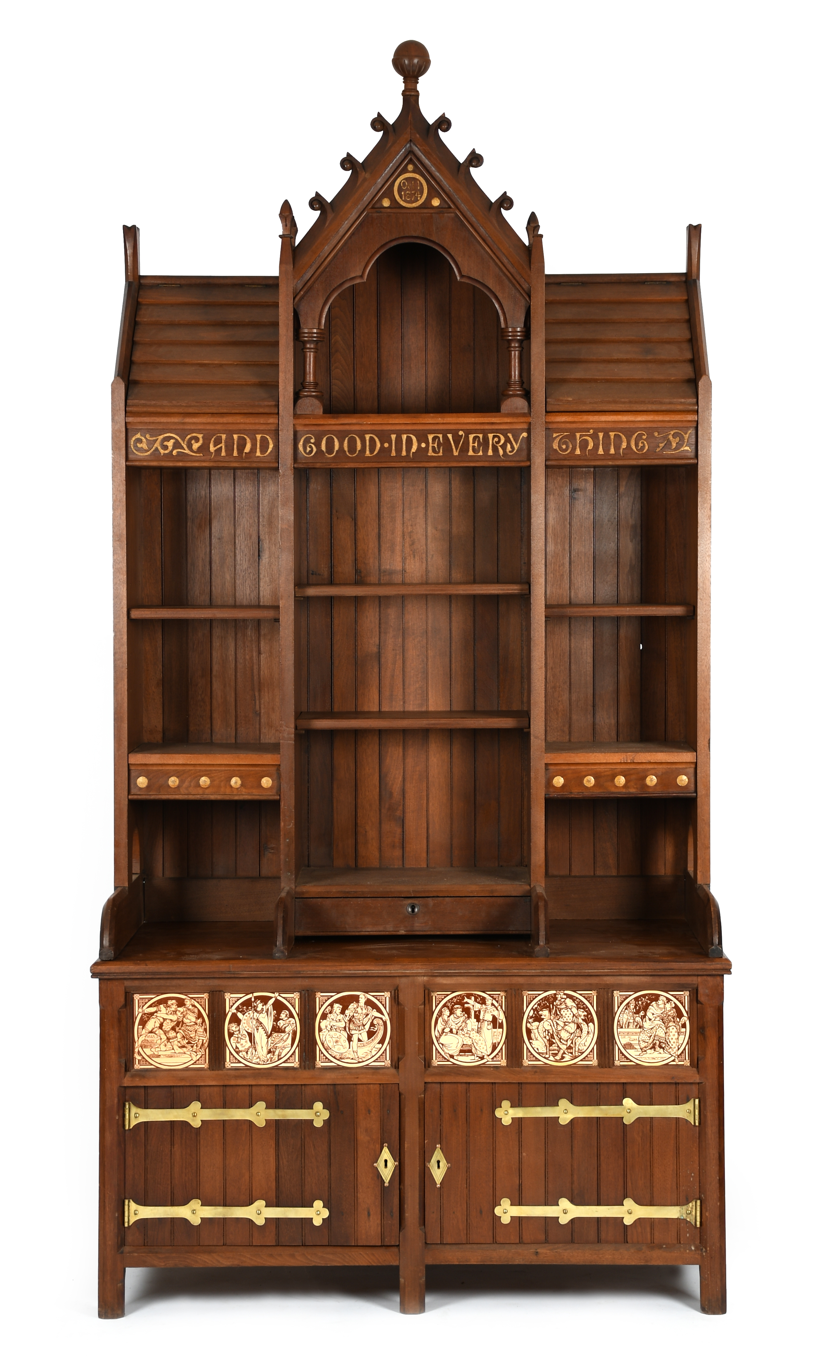 A large Reformed Gothic oak cabinet, twin cupboard with hinged doors, with a panel of six Minton tiles by John Moyr Smith, supporting tall bookcase with pitched roof, inscribed And Good in Everything, Oct 1st 1974, in gilt, with polished brass furniture, 124cm. wide, 62cm deep, 246 cm. high