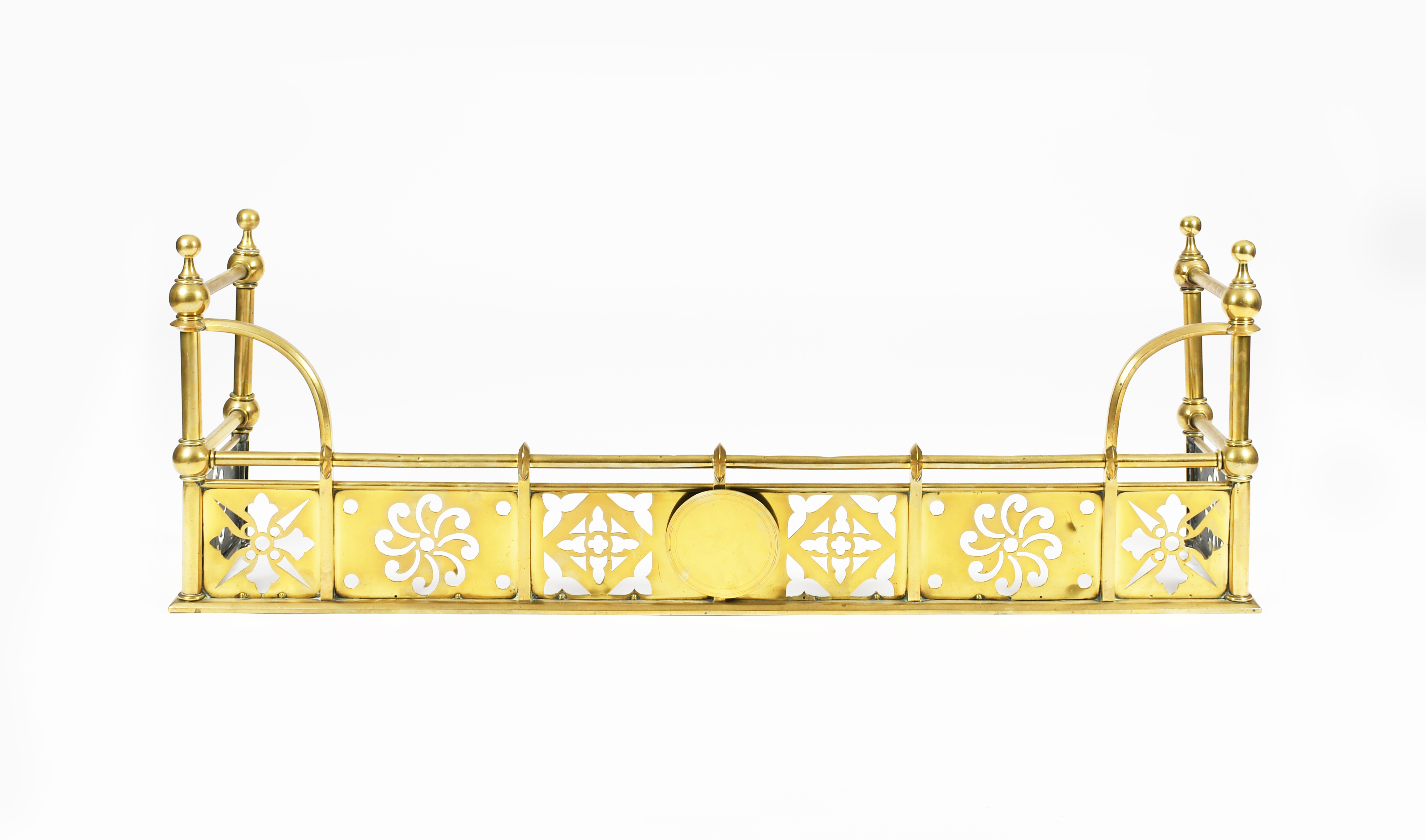 An Aesthetic Movement brass fender, the rectangular front panels with pierced geometric flowerhead design, with cylindrical brass columns with ball finials, unsigned, 141cm wide, 49cm. high
