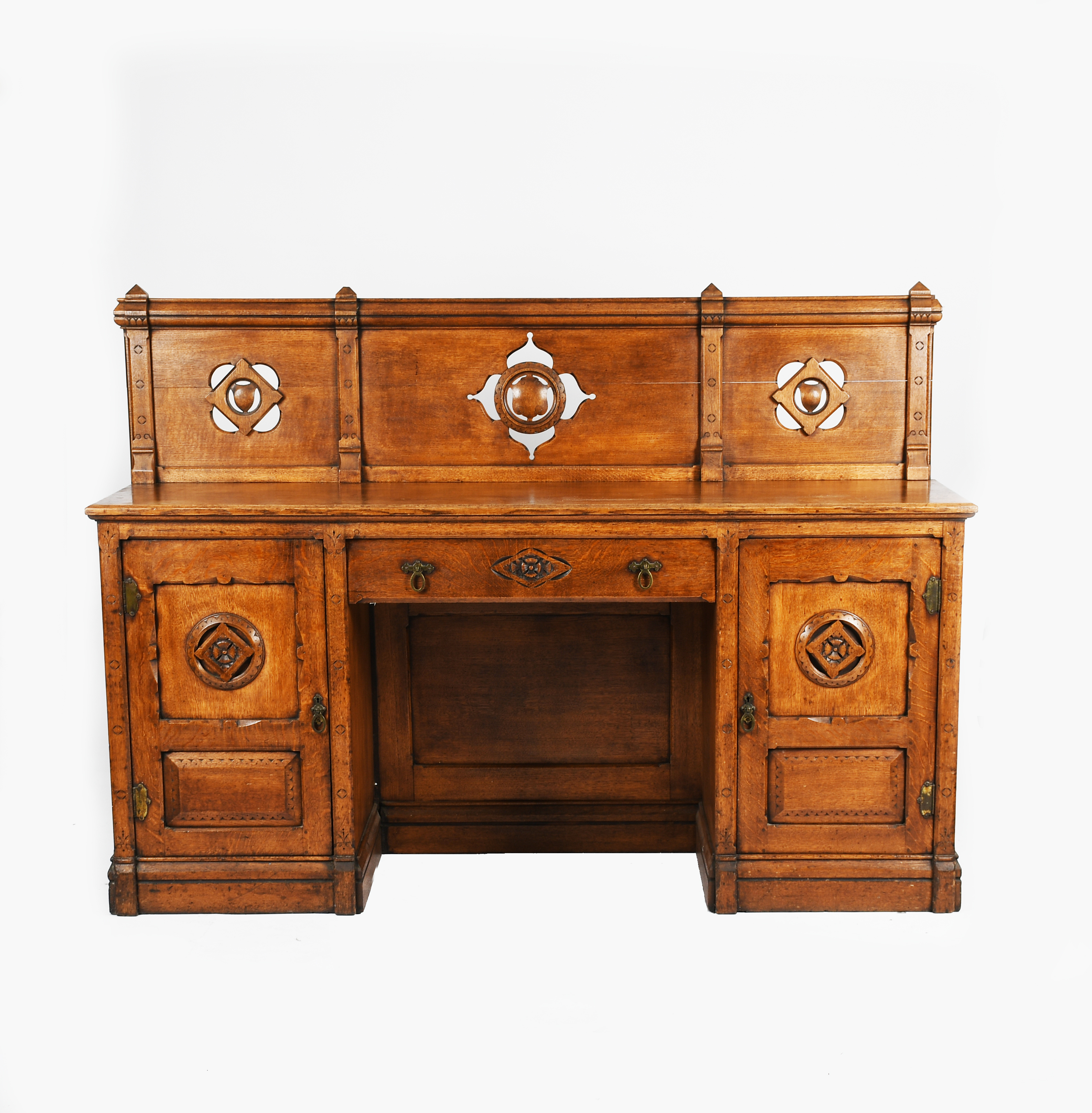 A Reformed Gothic oak desk in the manner of Bruce Talbert, rectangular top on hinged cupboards and central drawer, carved, pierced geometric panels, with raised back panel, with metal fittings, unsigned, 183cm wide, 56cm deep, 133cm high