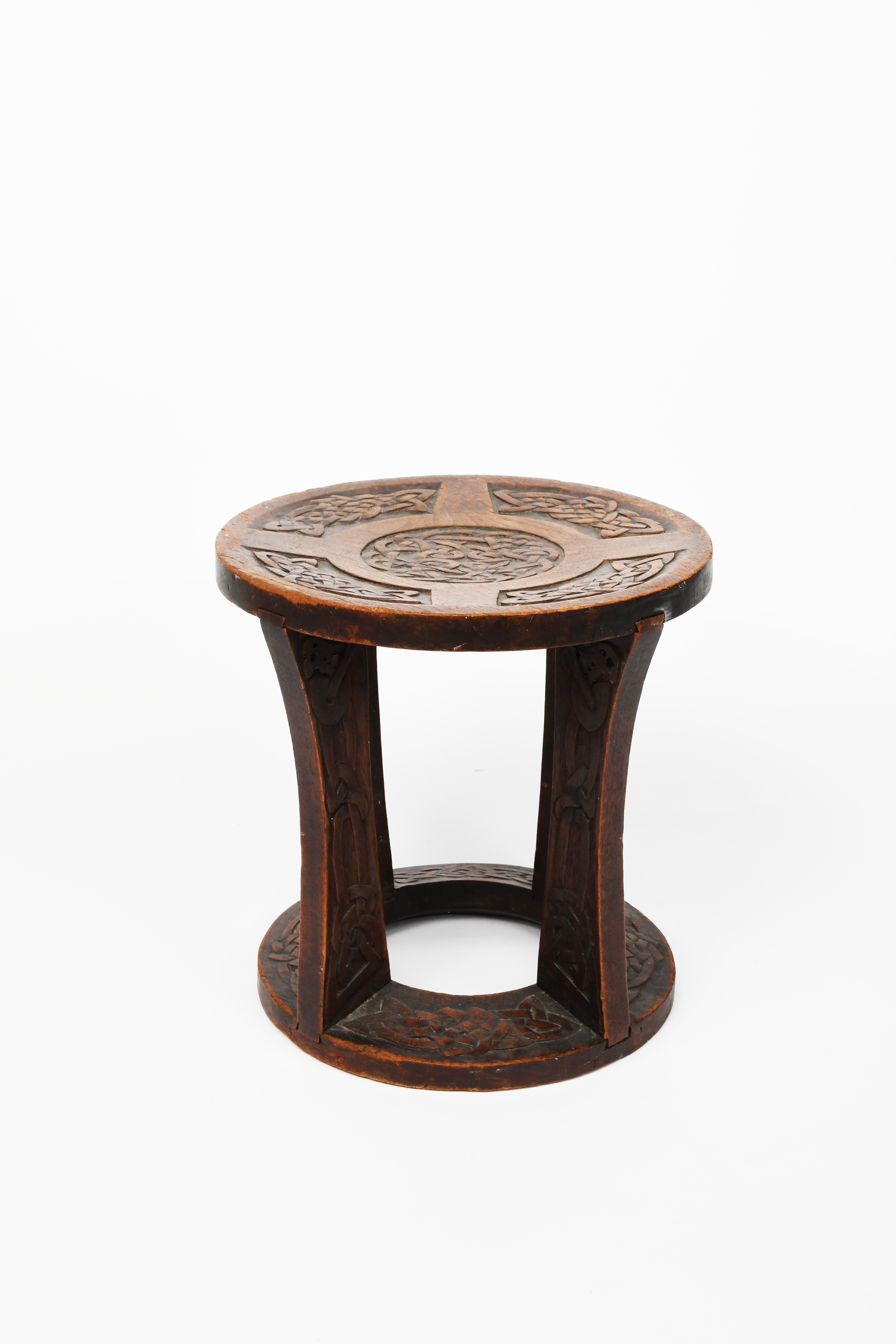 An Irish oak stool, circular seat with shaped legs, carved with panel of Celtic knot panels,