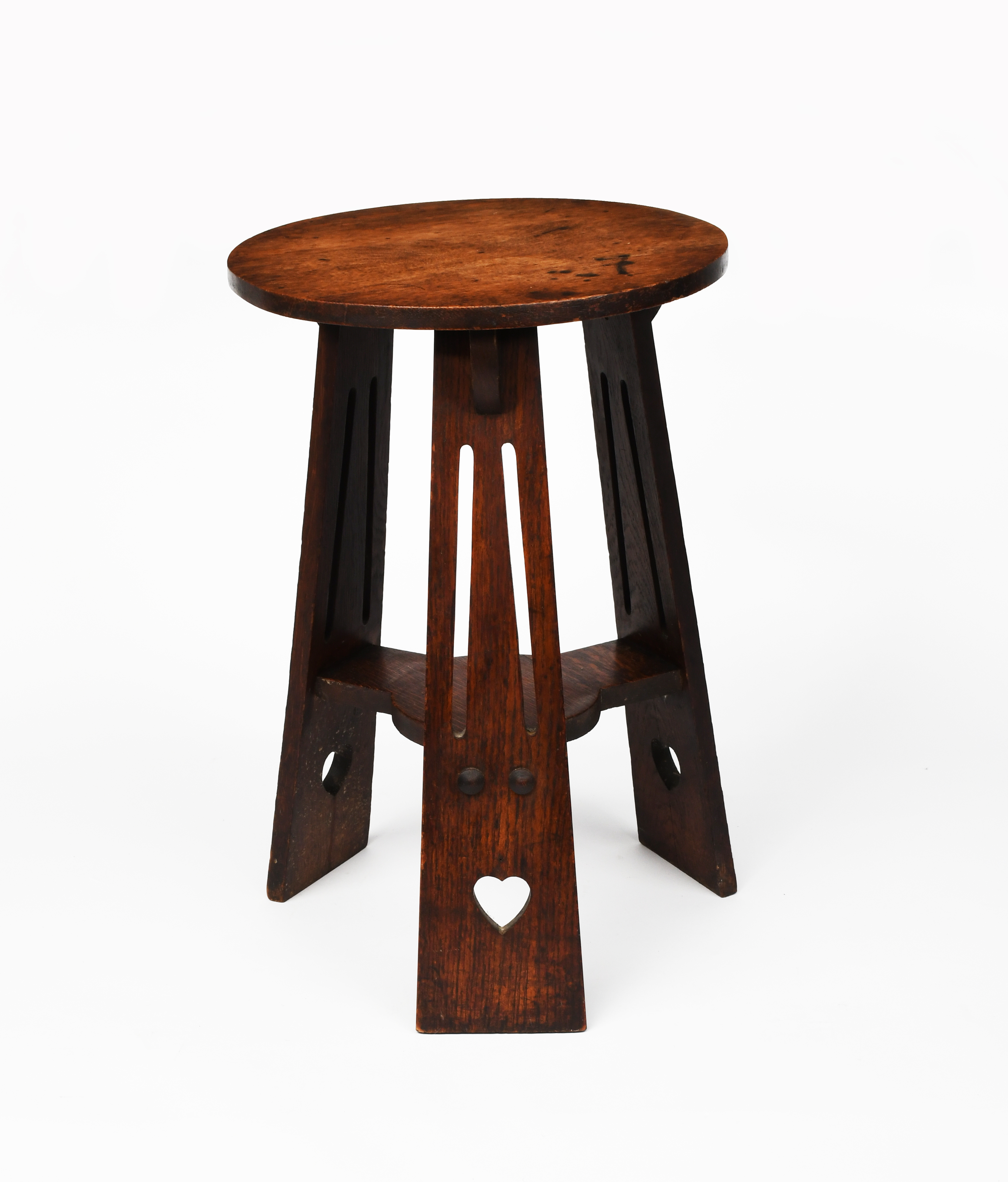 An oak occasional table probably retailed by Liberty & Co, circular section top on three flaring plank legs each with pierced panels and cut-out heart motif, unsigned, 61cm. high, 39cm diam.