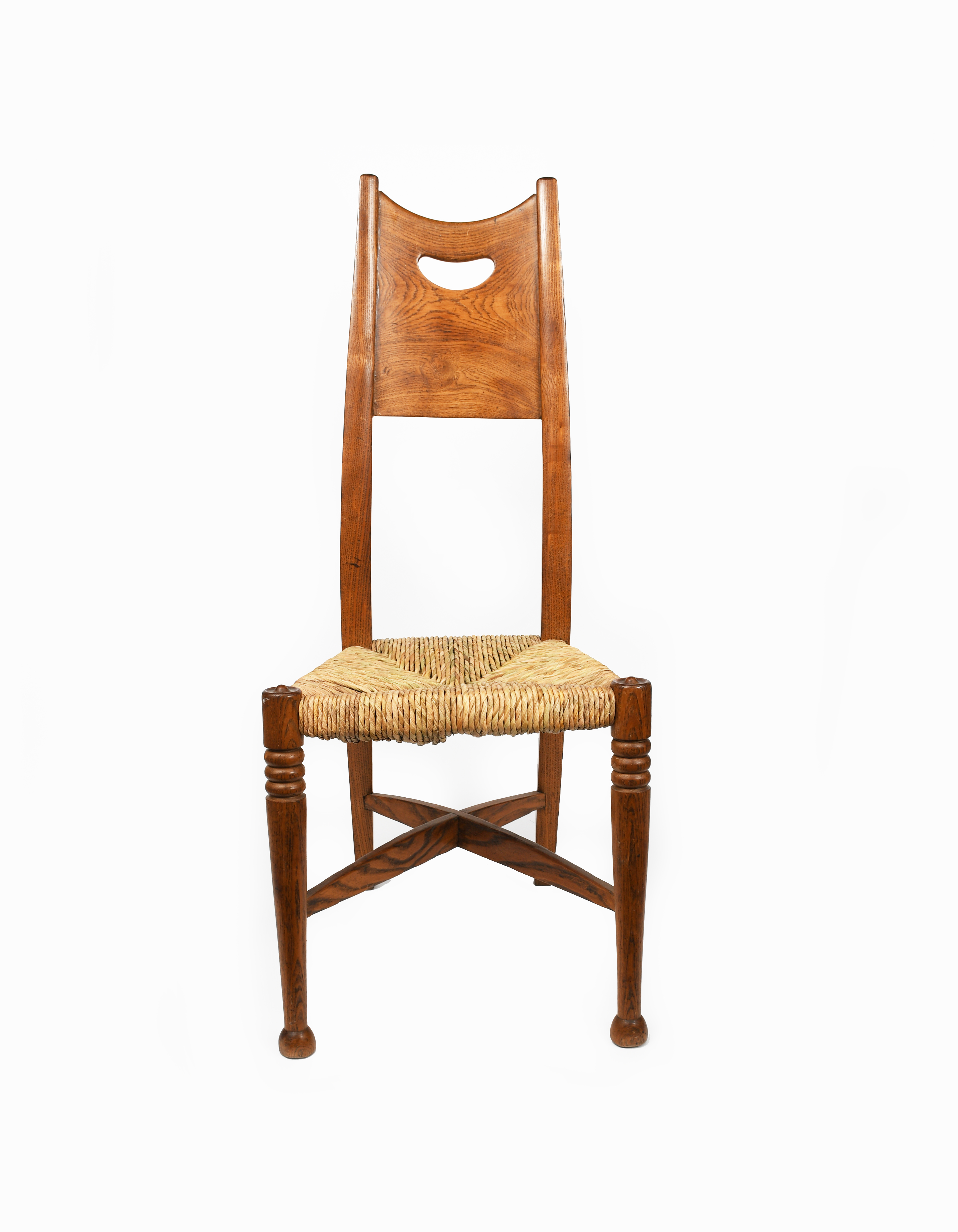 A William Birch rush-seated chair, with turned front legs, curved square section back legs, the solid back plate with cut-out heart motif, cross-stretcher, unsigned, 106cm. high