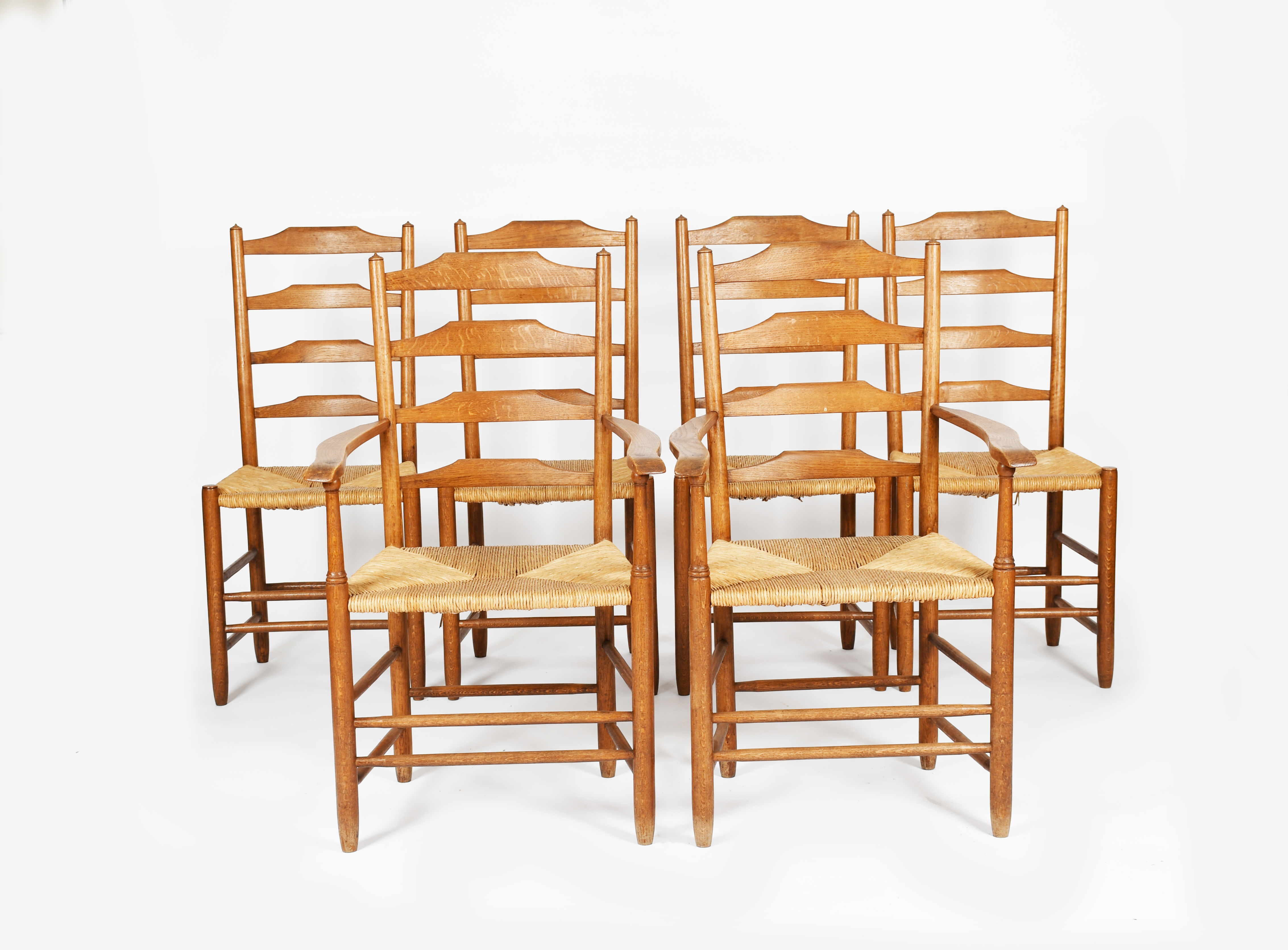A set of six ash ladderback chairs probably Neville Neal, with four graduated back splats, and rush seat, comprising four chairs and two carvers, apparently unsigned, 101cm. high (6)