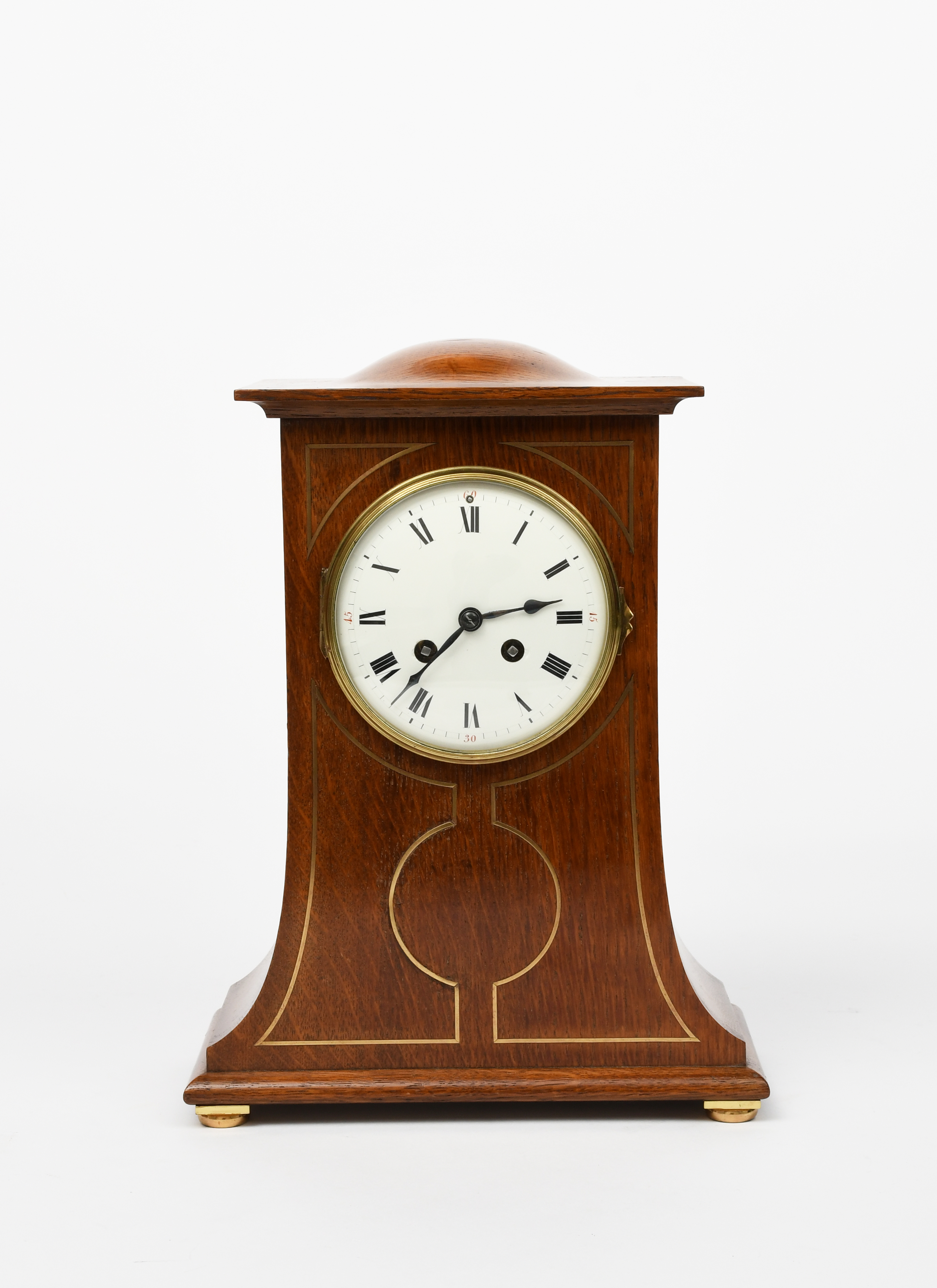 An oak mantel clock in the manner of Stanley Webb Davies, rectangular section, curved tapering form with flaring mantel and domed top, the front inlaid with brass, enamelled, circular dial with Roman numerals, on brass feet, unmarked, 35cm. high