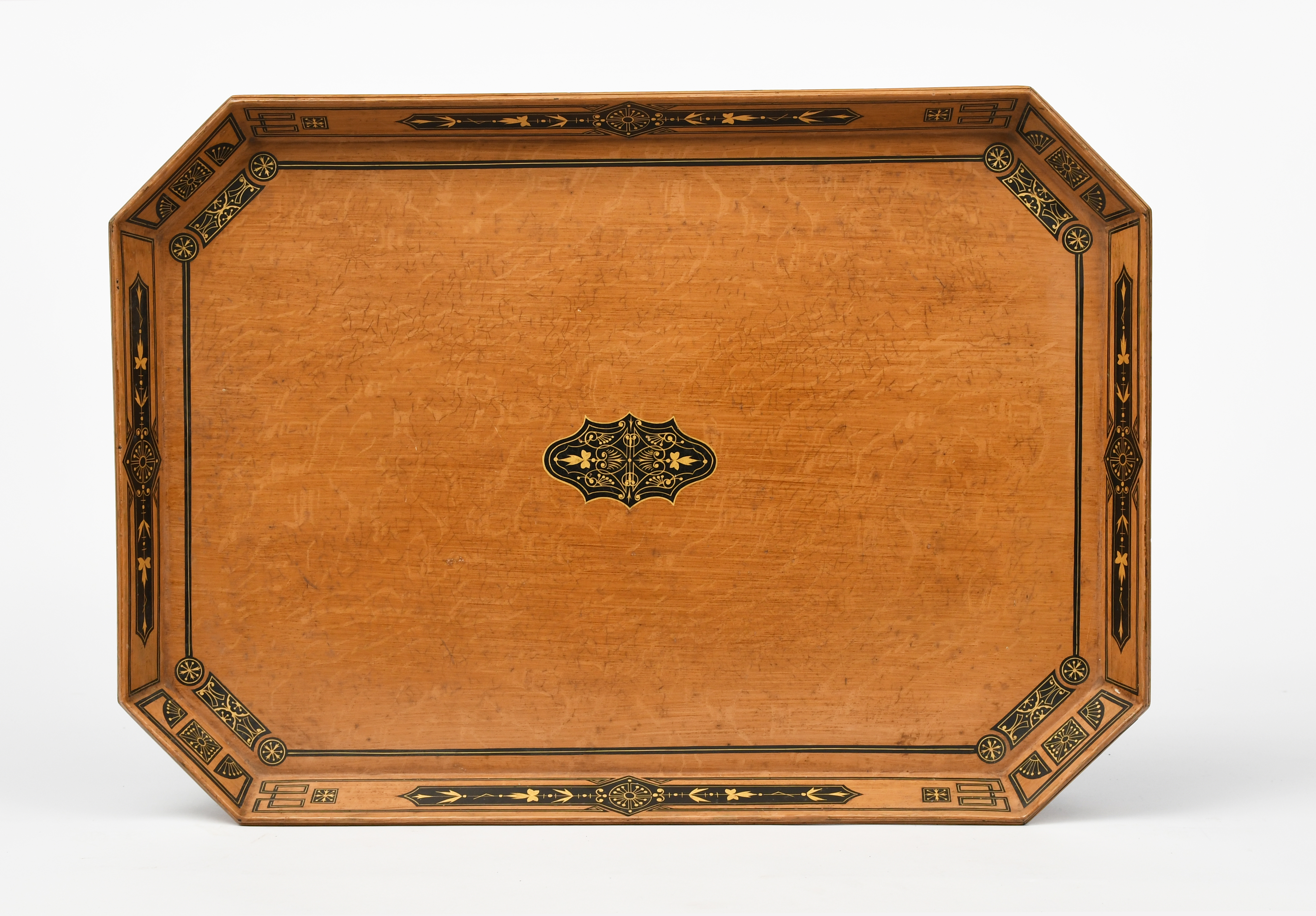 An octagonal oak tray in the manner of Dr Christopher Dresser, the raised rail painted with geometric panels of stylised foliage, in black and gilt, the tray with central panel, unsigned, 59 x 42.5cm.