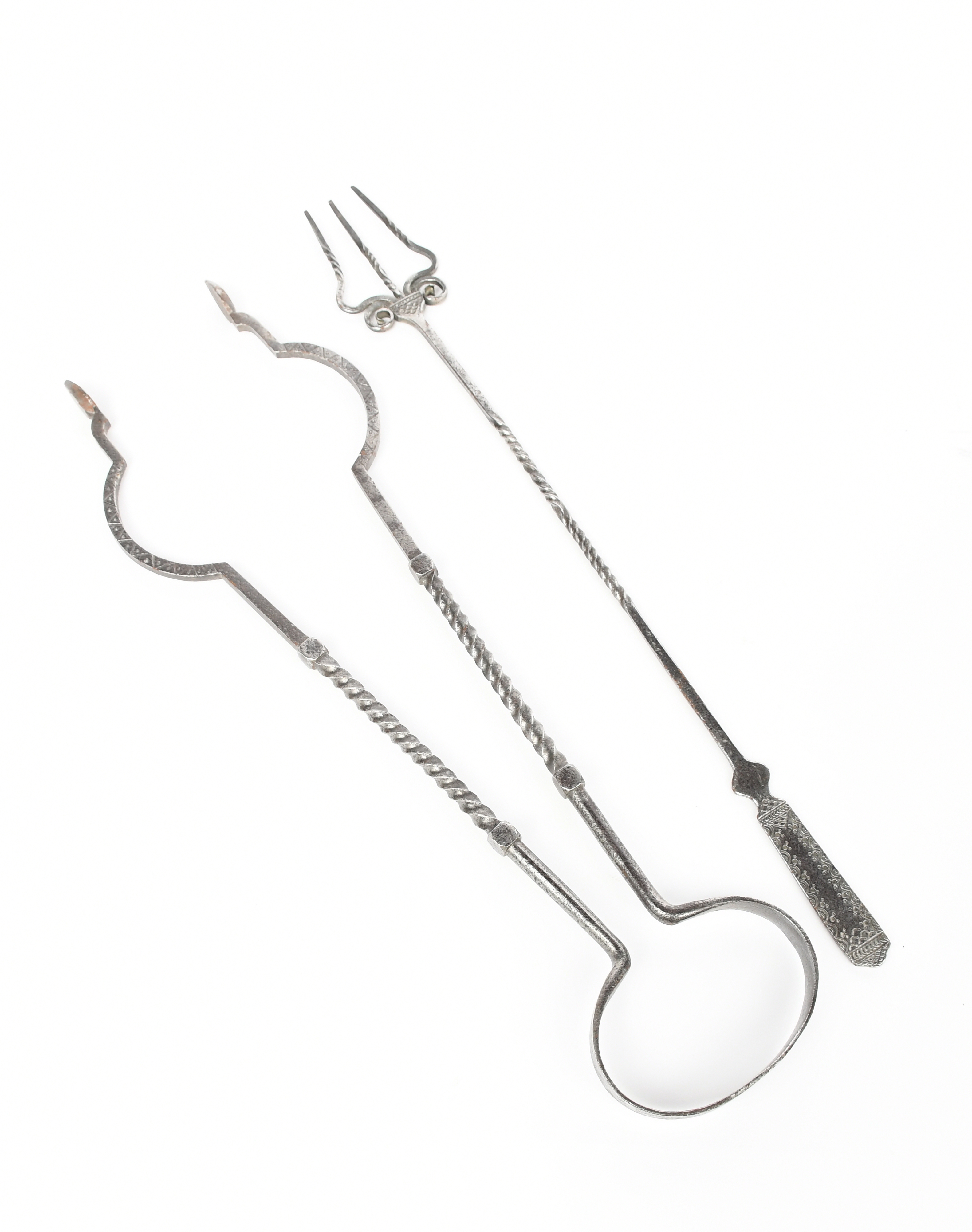 A pair of Thornton & Downer fire tongs and a toasting fork, wrought steel, square section with