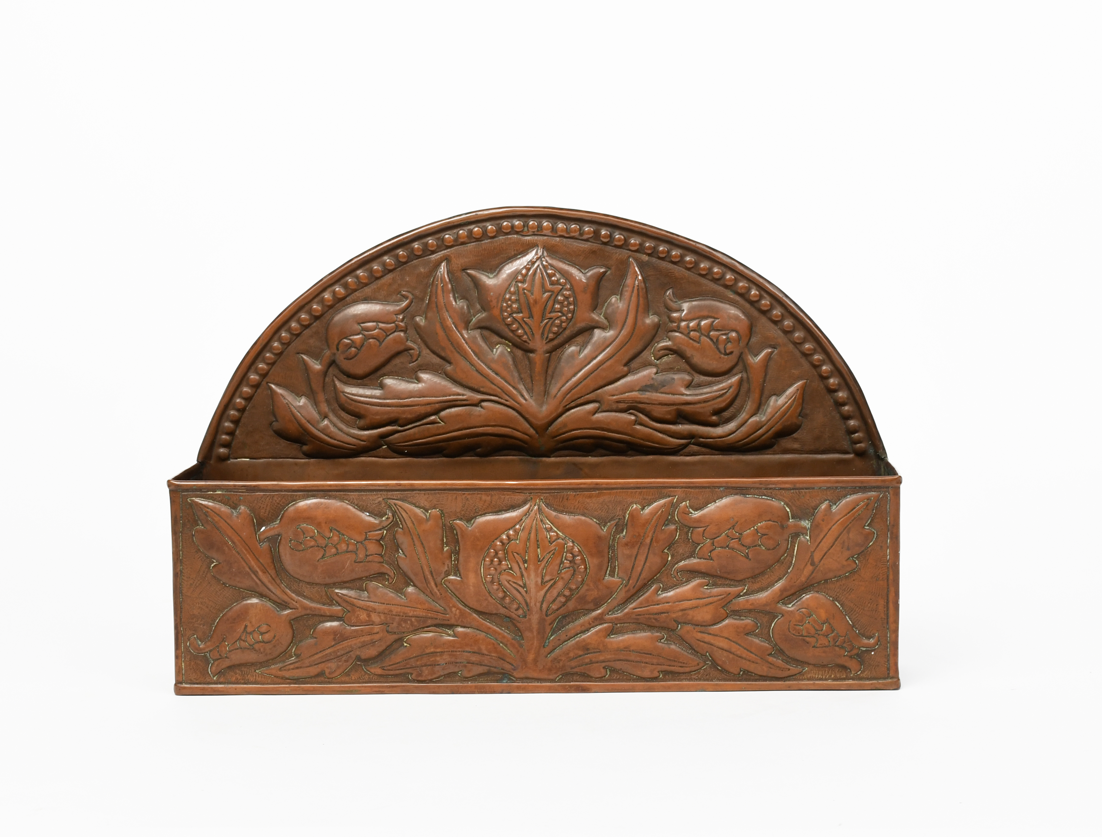 A patinated copper letter rack in the manner of John Pearson, rectangular section with semi-circular back plate, stamped in low relief with splitting pomegranate motif, and a hammered copper chamberstick, unsigned, 40cm. wide. (2)
