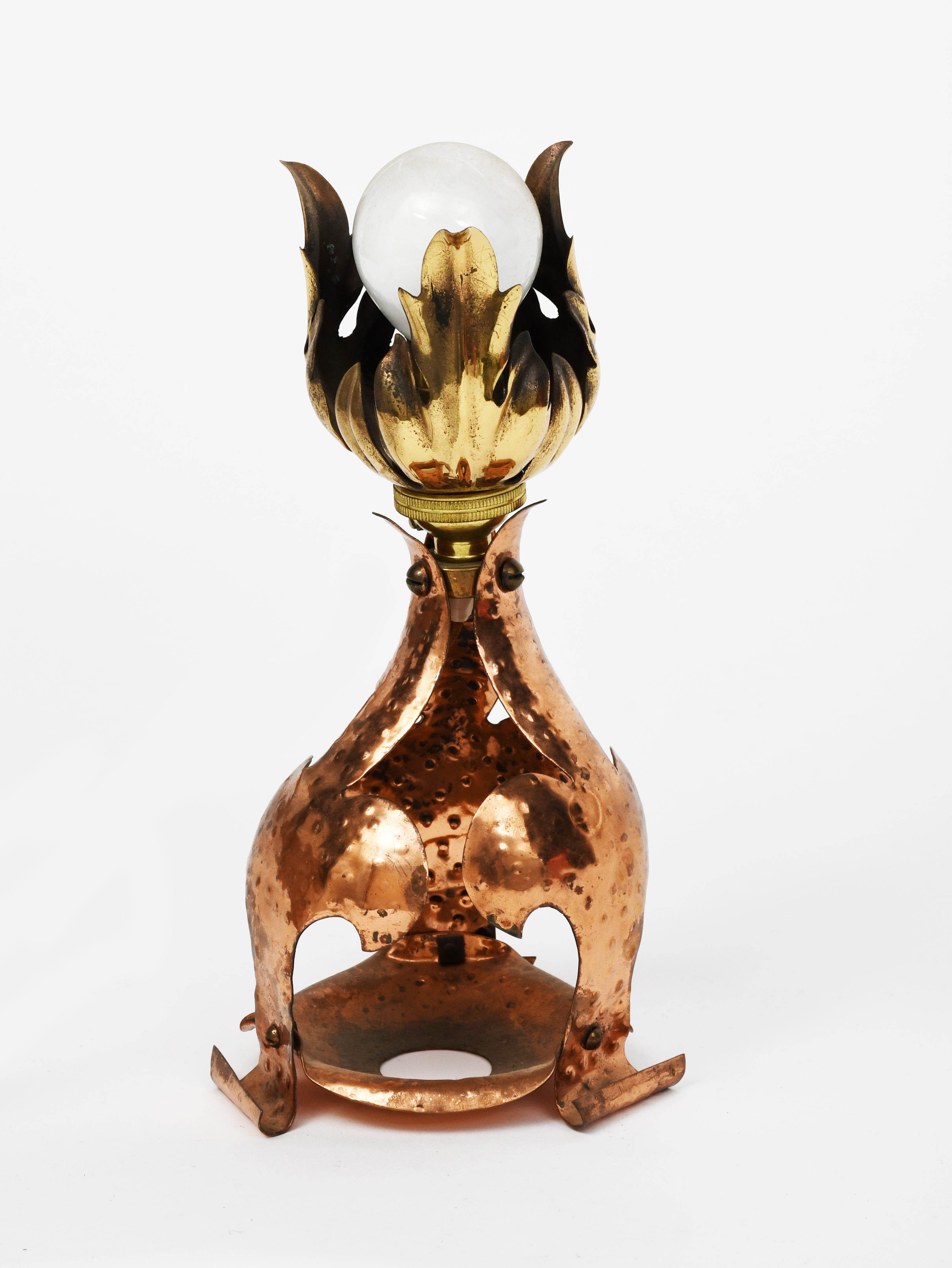 A copper and brass lamp in the manner of WAS Benson, foliate form, unsigned, 22.5cm. high