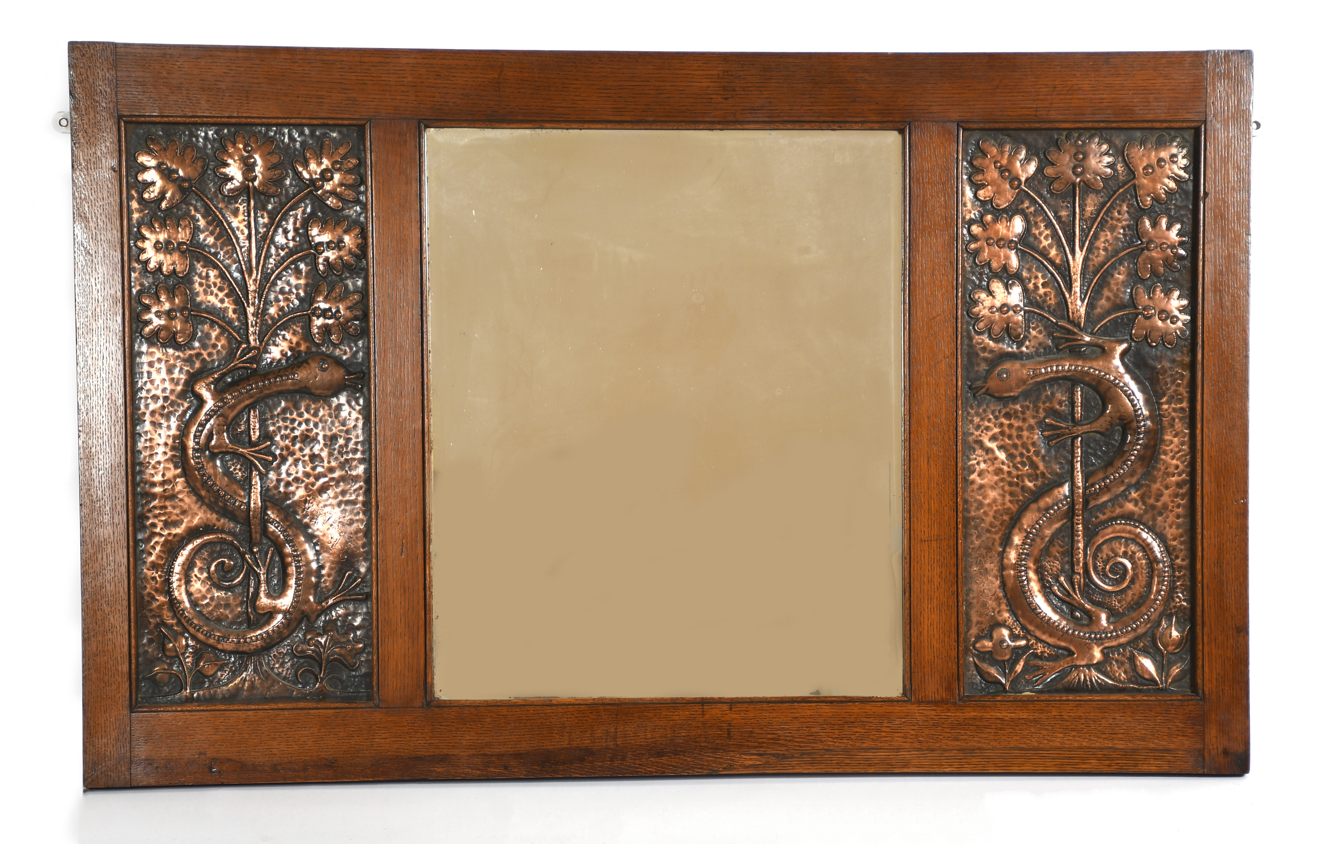 A large and impressive John Pearson oak and repousse copper wall mirror, rectangular, oak frame with central bevelled glass mirror, flanked with two repousse copper panels each hammered in deep relief depicting a gecko climbing a stylised branch, above simple flower and foliage motif, stamped signature and date visible to left hand panel 122 x 76cm, 59 x 24cm (panels)