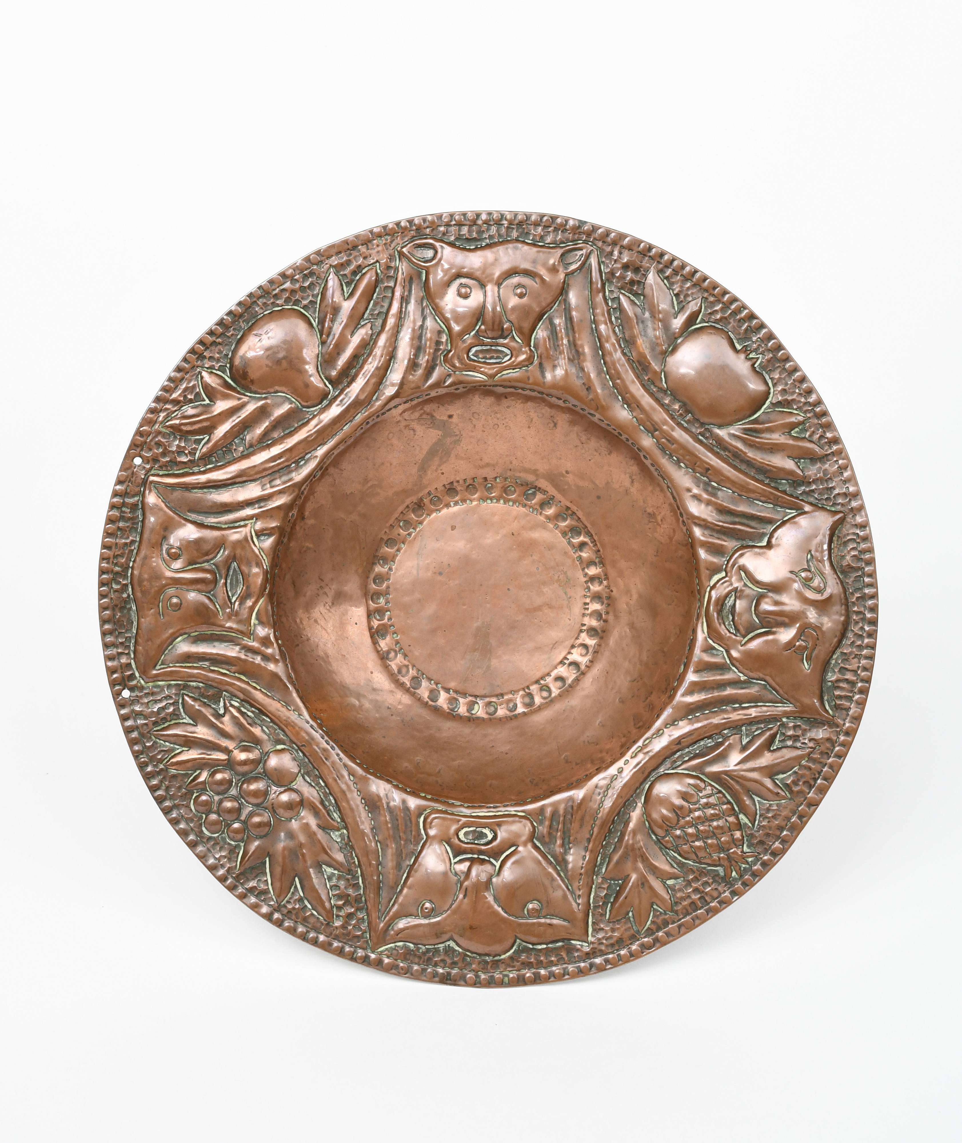 A repousse copper plate by John Pearson, dated 1902, hammered to the rim with a frieze of masks and stylised fruit and swags, hammered JP 1902, 24.5cm. high