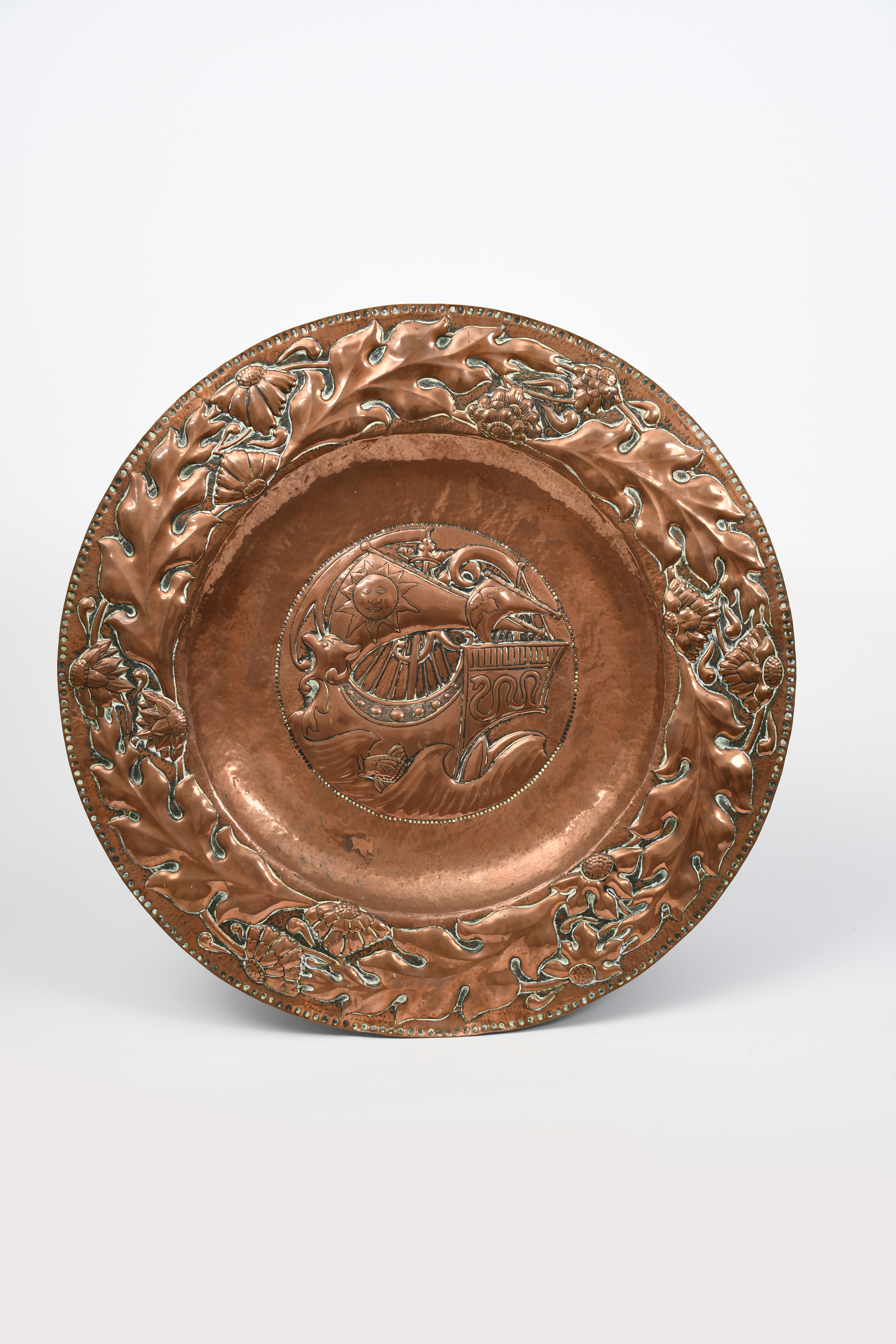 A large repousse copper charger probably by John Pearson, hammered to the well with a galleon at