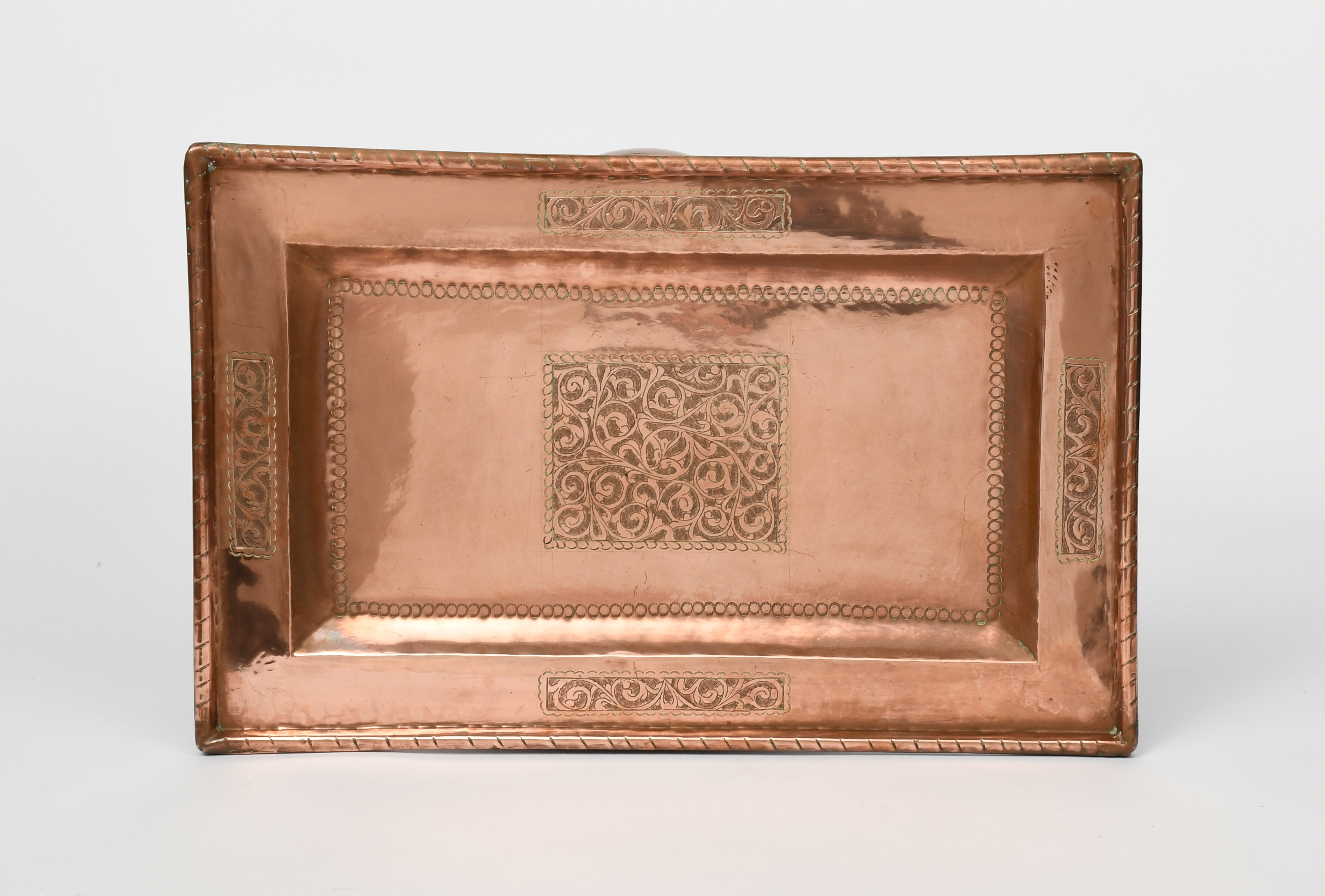 A Fivemiletown copper tray, rectangular with raised rim, engraved with rectangular panels of scrolling foliage to middle and raised rim, unsigned, 56 x 36cm.
