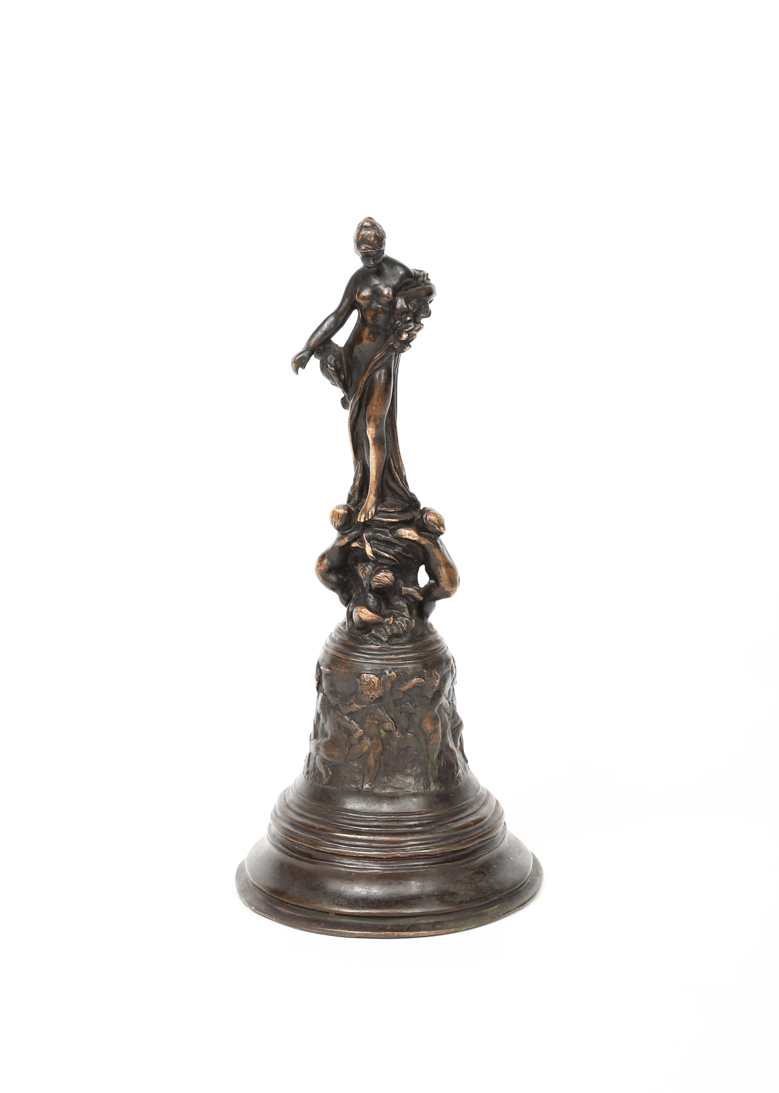 the figure appears to have lost a drape which should be in her right hand, otherwise some light dents, wear to patination.