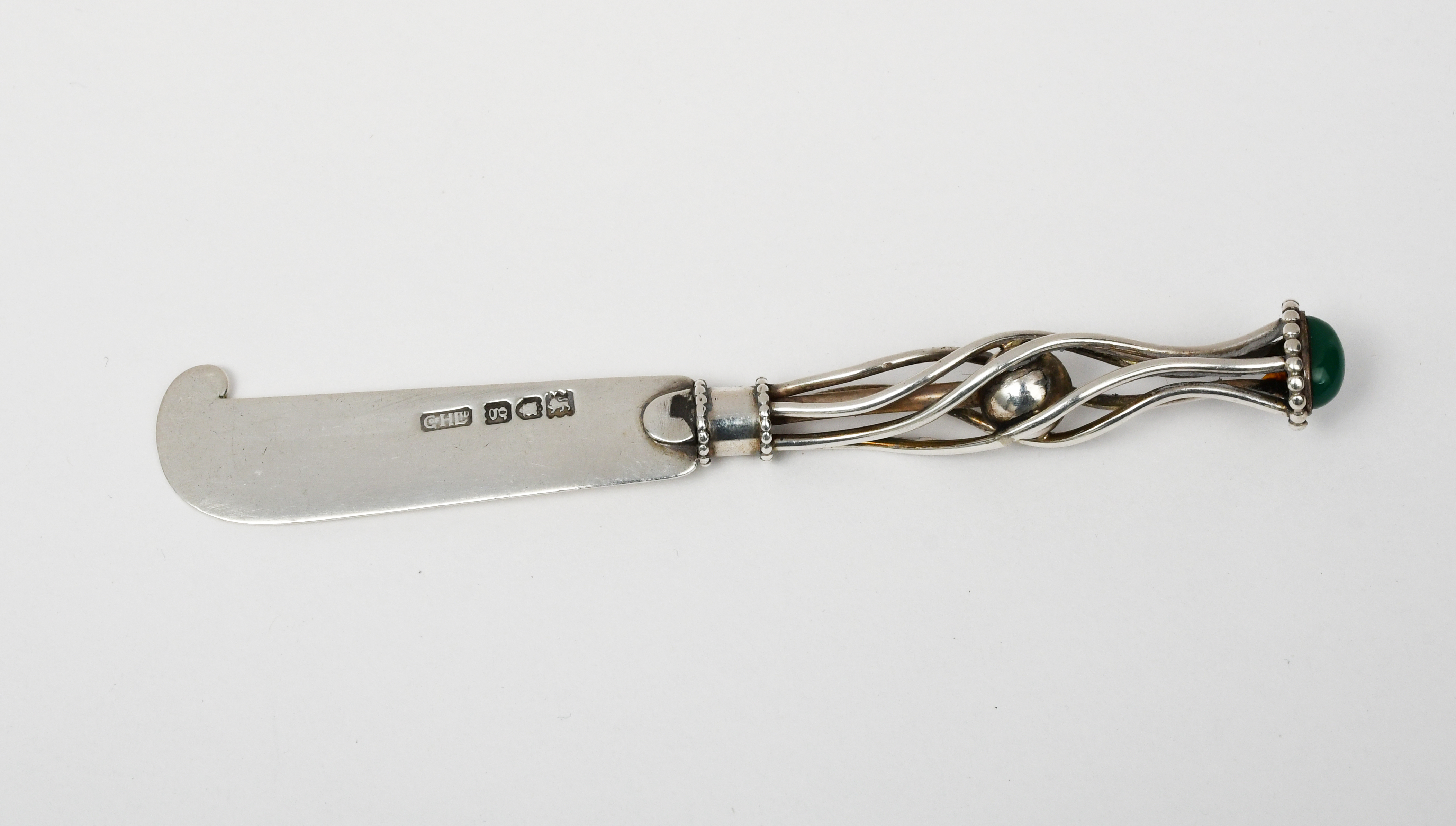 A Guild of Handicraft Ltd silver butter knife designed by Charles Robert Ashbee, the wirework handle set with green chrysoprase terminal, stamped marks, London 1902, 14cm. long
