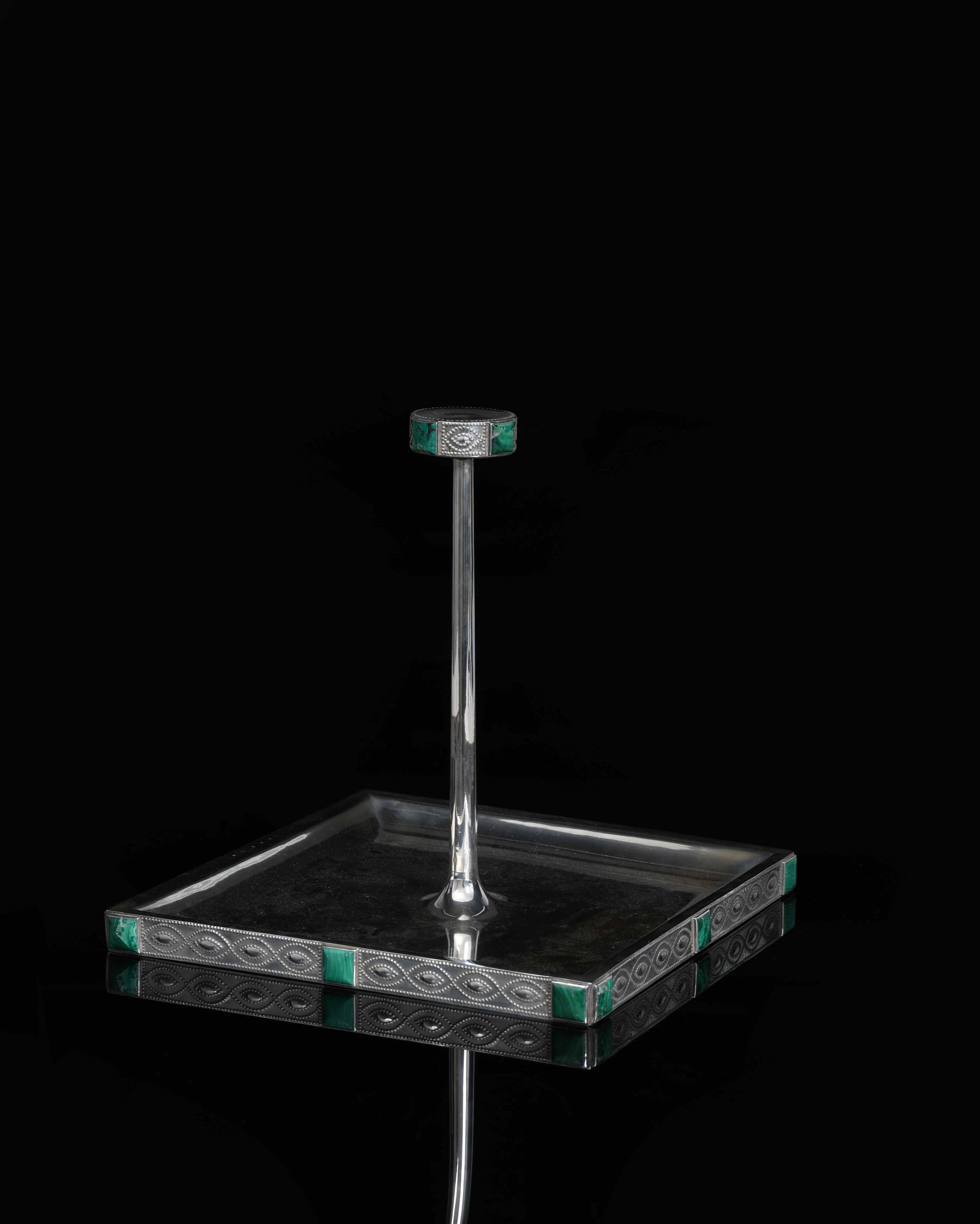A Wiener Werkstätte silver and malachite tray designed by Josef Hoffmann for Palais Stoclet Brussels, model S1133, made by Alfred Mayer, the flat, square section tray with a band of elliptical panels, set with square malachite panels, central cylindrical stem with disk finial, set with square malachite panels,