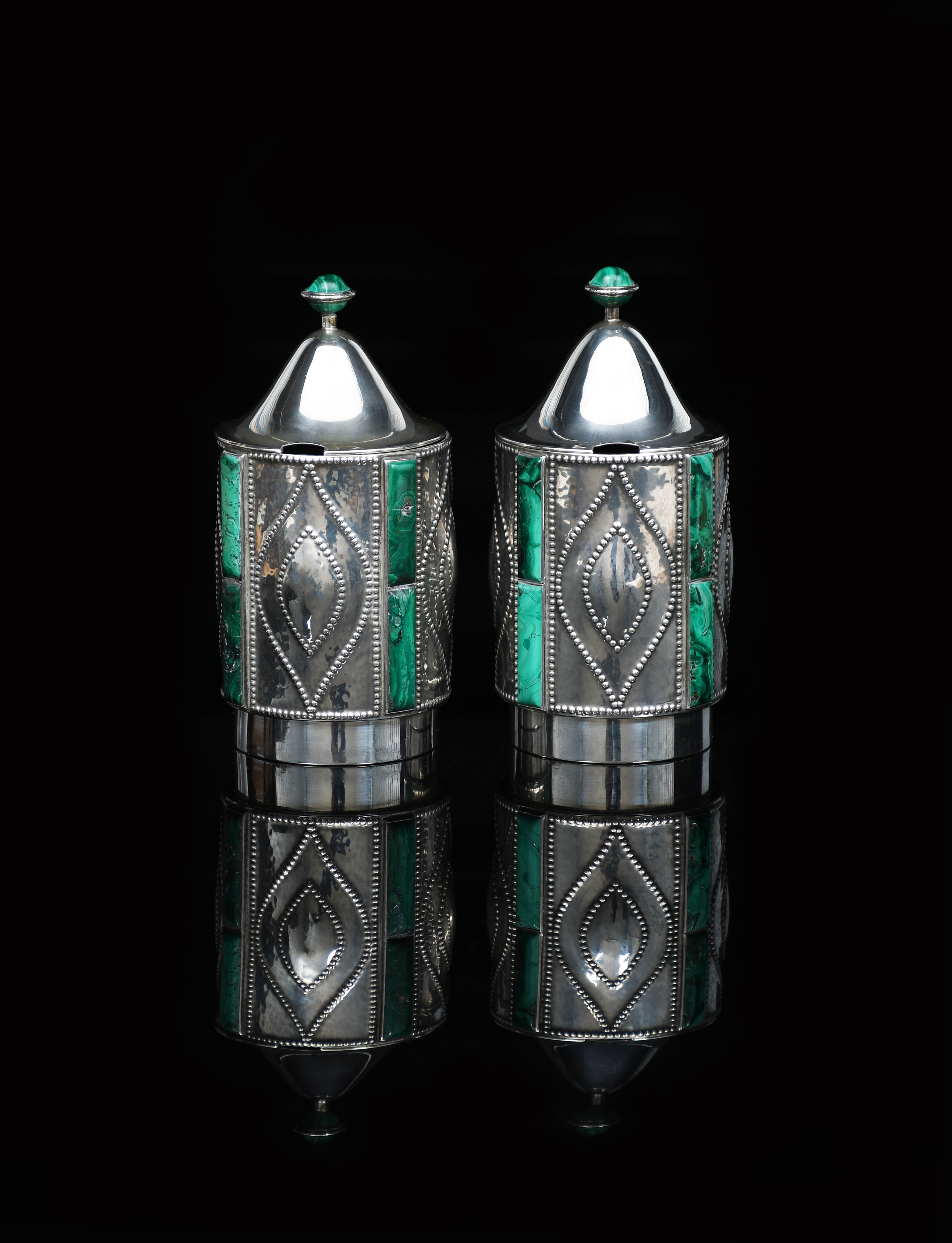 A pair of Wiener Werkstätte silver and malachite preserve jars designed by Josef Hoffmann for Palais Stoclet Brussels, made by Josef Hossfeld, each cylindrical form with hinged cover, with elliptical panels inter-spaced with rectangular malachite columns, the tapering, domed cover with silver and malachite finial,