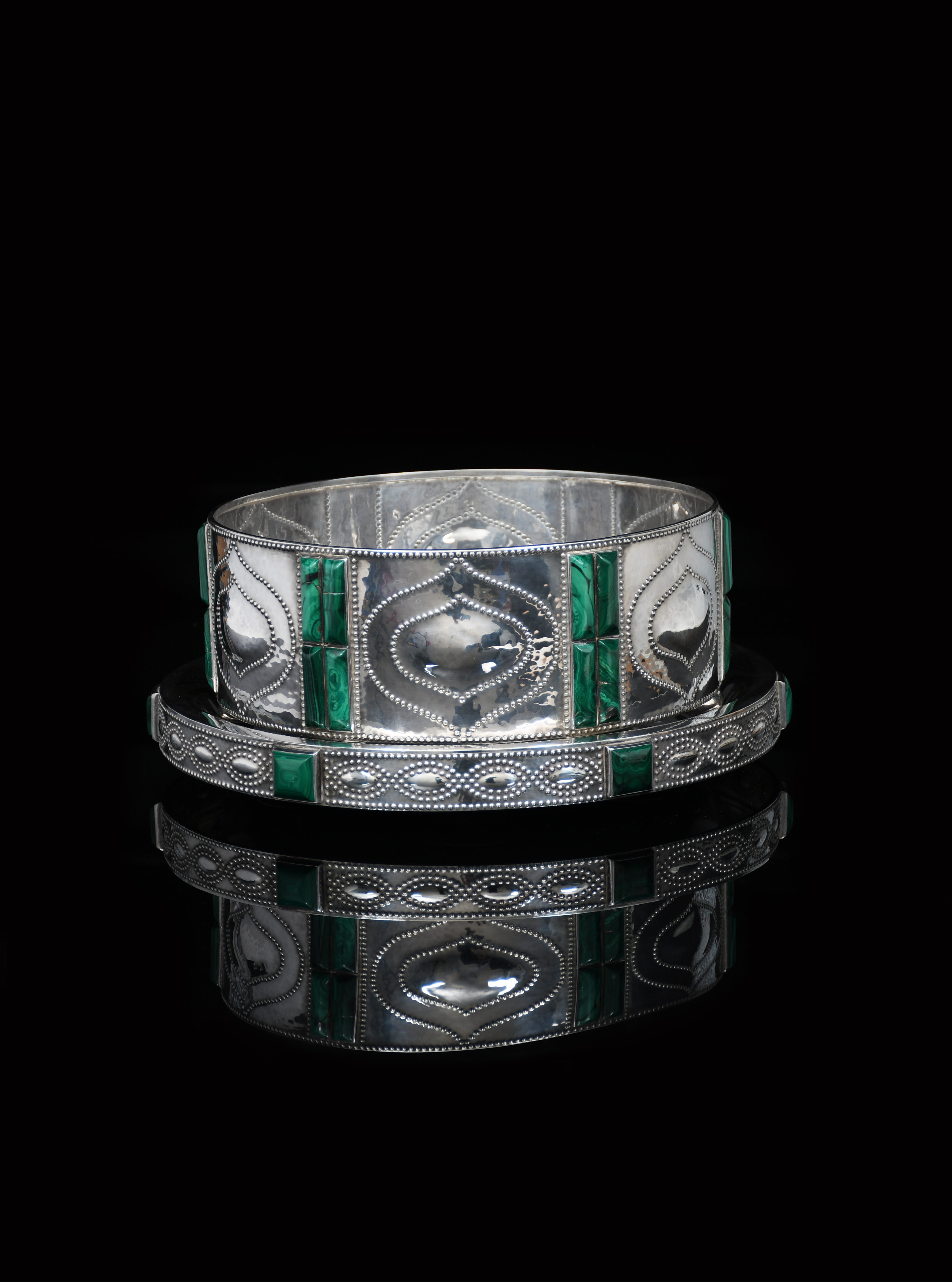 A Wiener Werkstätte silver and malachite centrepiece designed by Josef Hoffmann for Palais Stoclet Brussels, model S.1053, made by Alfred Mayer, cylindrical form on six bun feet, with elliptical panels inter-spaced with rectangular malachite columns, and a later silver and malachite tray designed by Josef Hoffmann, made in Belgium, stamped Wiener Werkstätte marks, JH monogram, AM monogram to centrepiece, 22.5cm. diam (2)