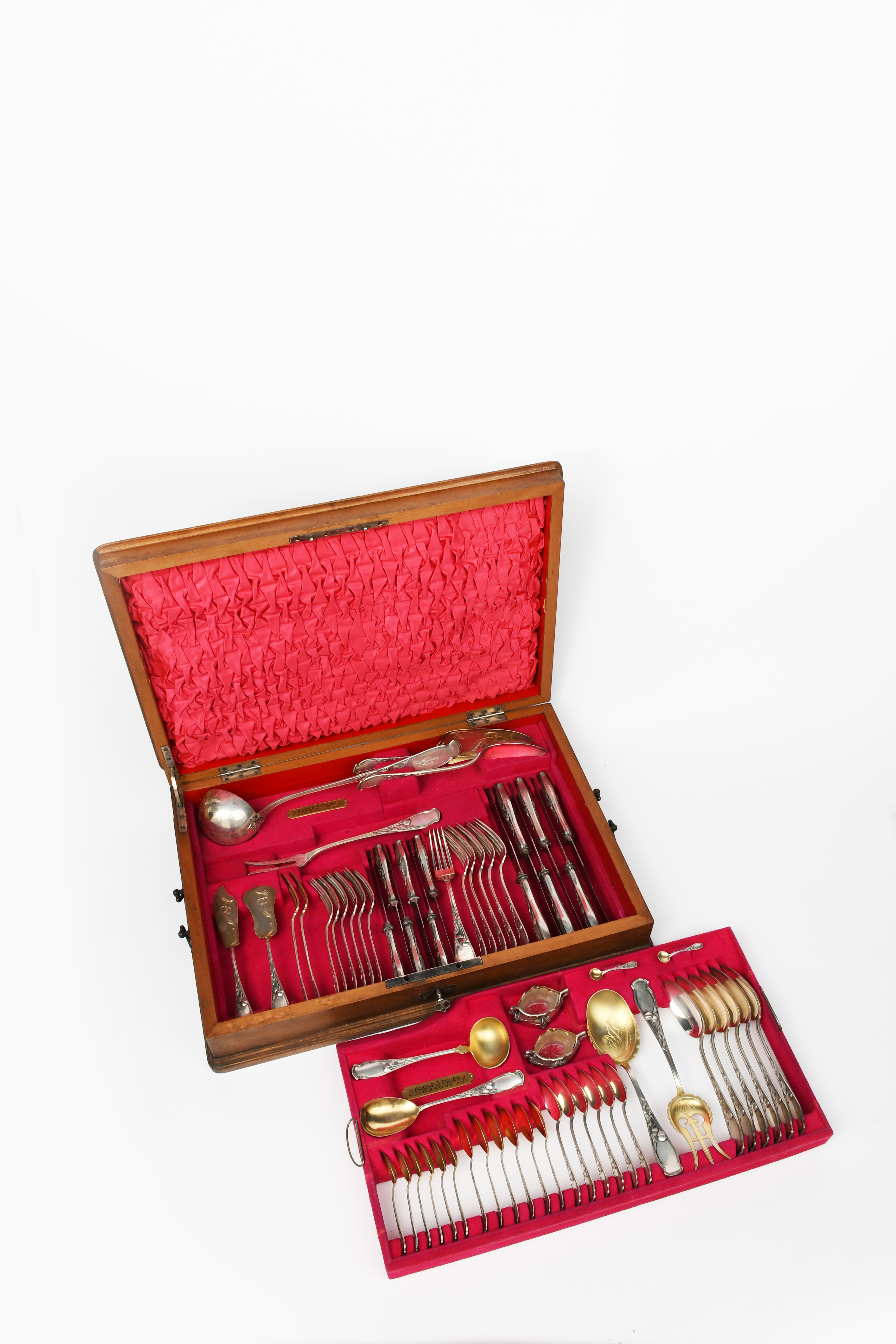 An Art Nouveau Cherry pattern silver-gilt canteen of cutlery by Franz Bahner, retailed by Adolf Stoba, model no.3900, silver and silver gilt, cast in low relief with a cherry design, and engraved monogram to handle, comprising; six knives and forks, six butter knives, six cake forks, two serving forks, two slices, a fish slice, a serving spoon, a meat knife, a large ladle, two salts with glass liners and salt spoons, six dessert spoons, six teaspoons, two sets of six smaller spoons, a pair of servers and two serving ladles, a wooden canteen with hinged cover and pierced silver panels, stamped marks, 22.5cm. wide (largest serving fork), 53.5cm. wide (canteen)