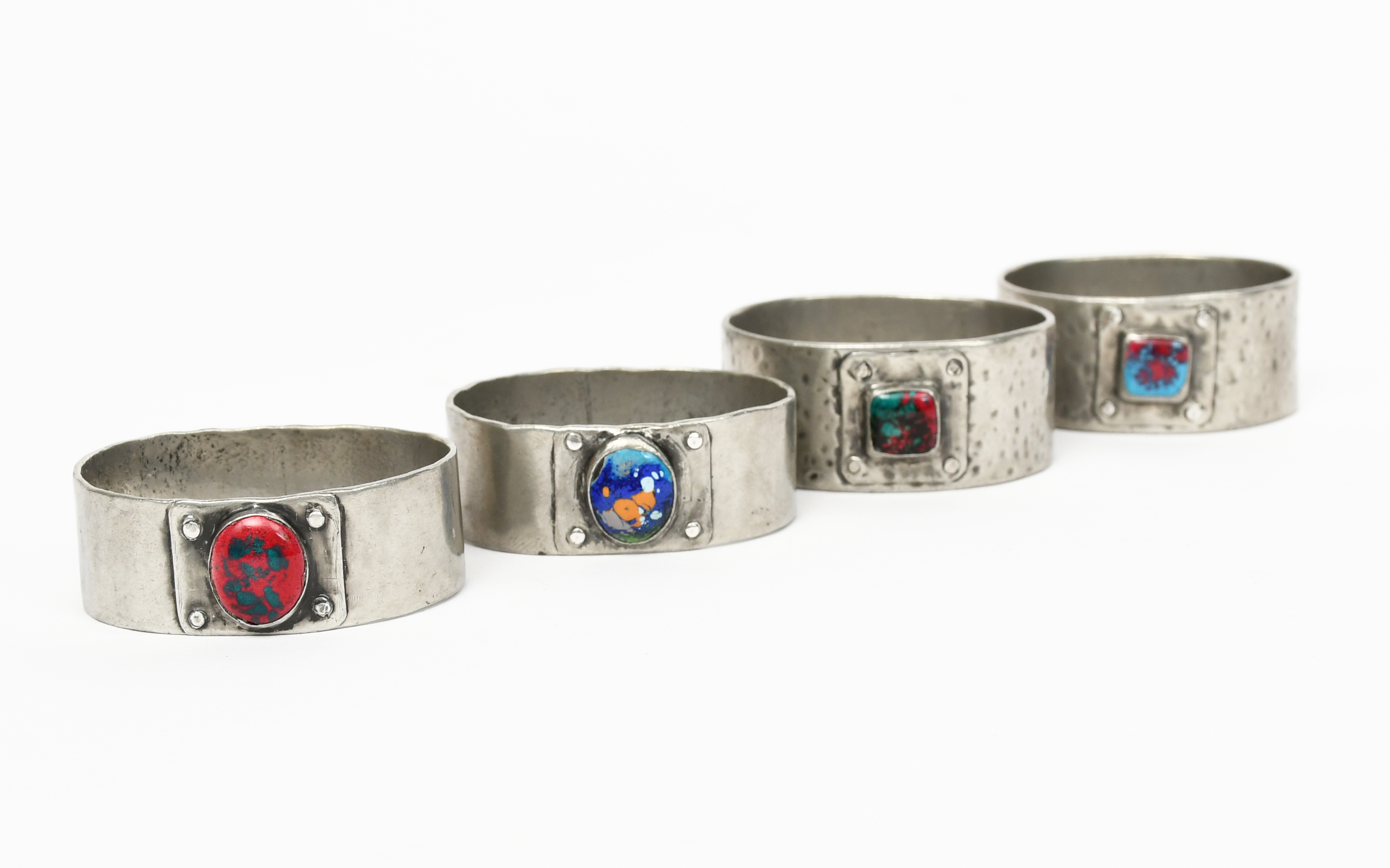 Four pewter and enamel napkin rings, each elliptical, hammered form with coloured enamel panel,