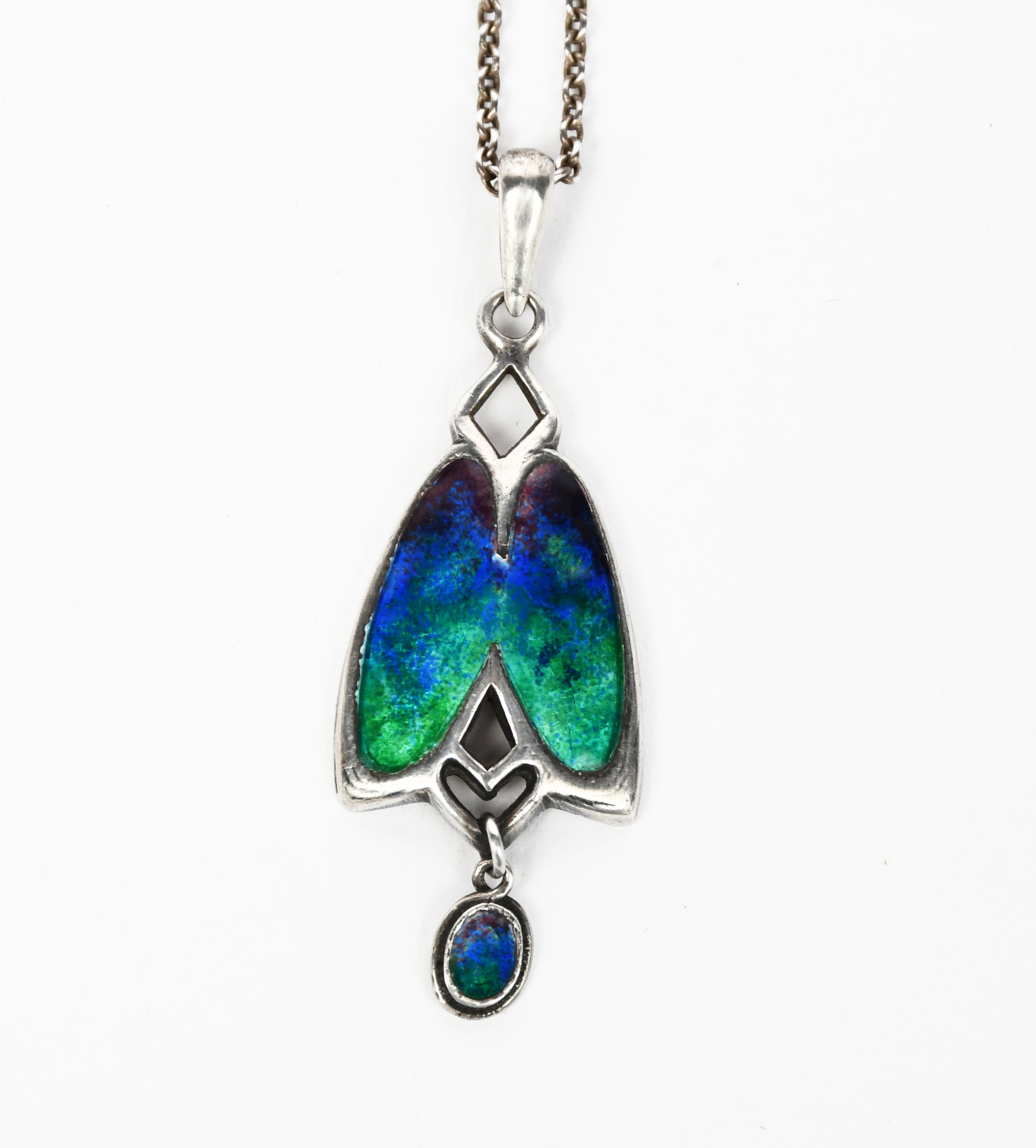 A William H Haseler silver and enamel pendant necklace, modelled as a stylised moth, enamelled blue and green, with simple enamel drop, on chain, stamped marks, 4.5cm. long