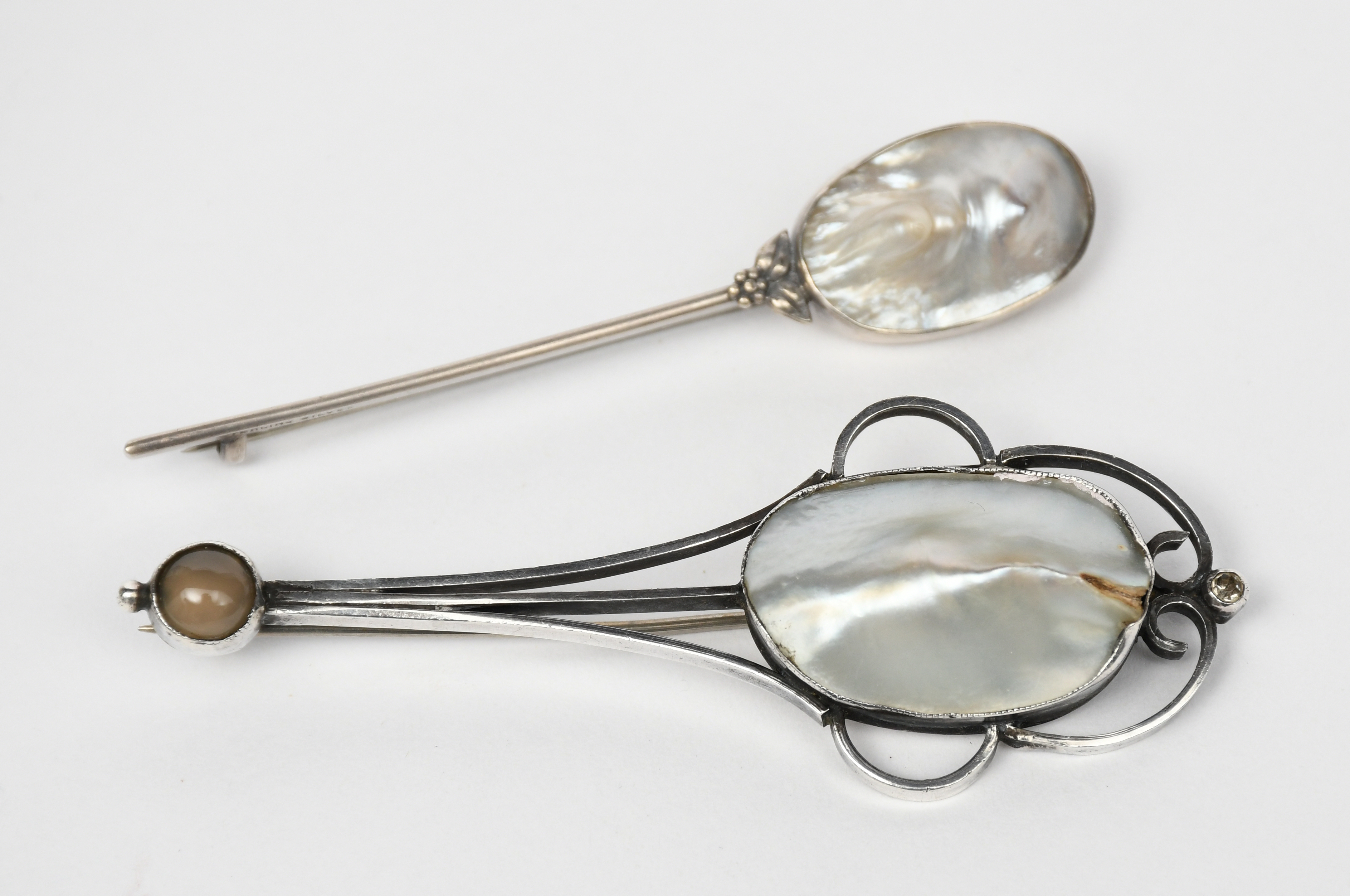 A George Hunt silver and abalone shell brooch, scrolling wirework form with large elliptical abalone shell, and small polished cabochon, and another silver brooch by George Hunt set with abalone shell, stamped marks, 8cm. wide (2)